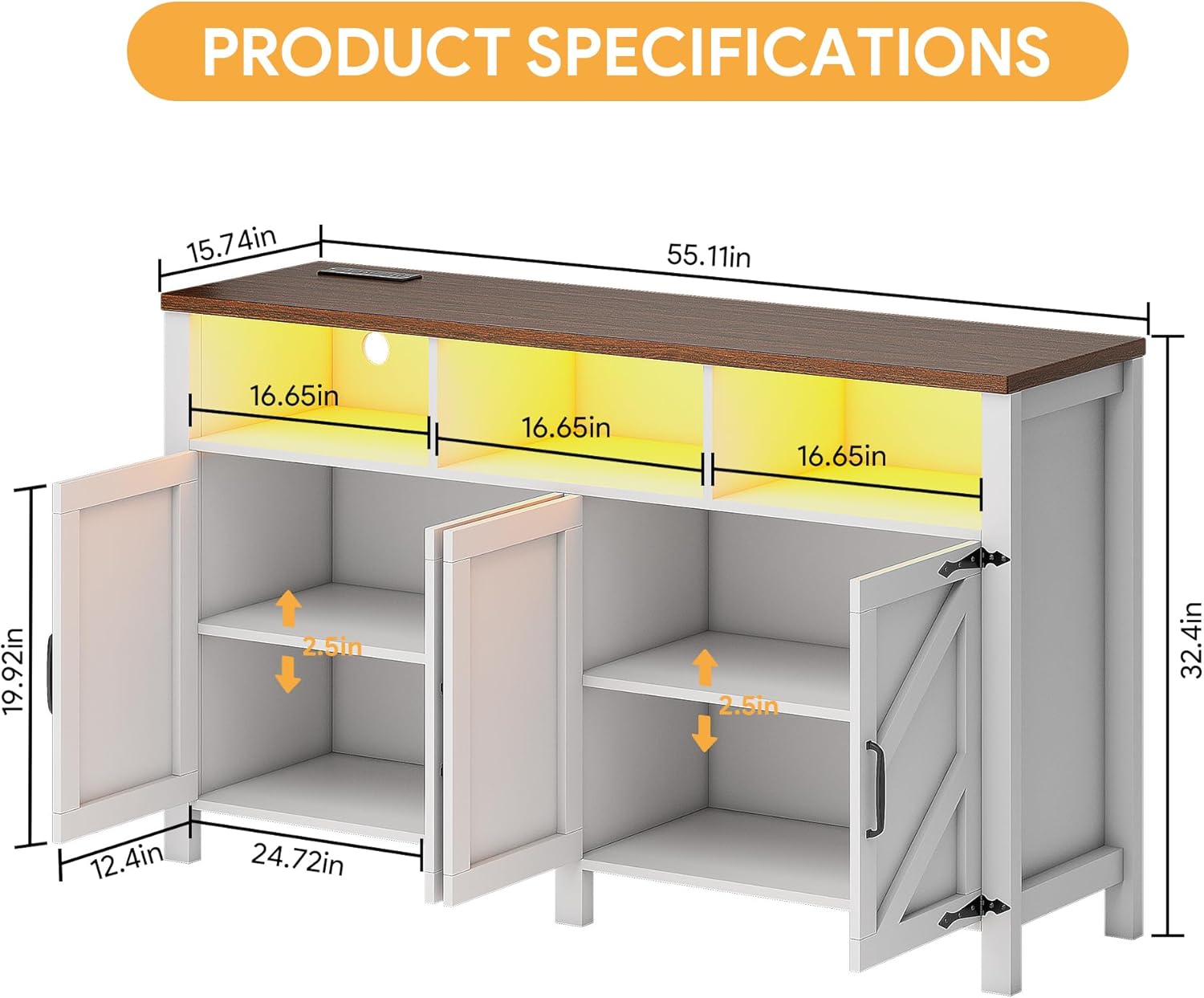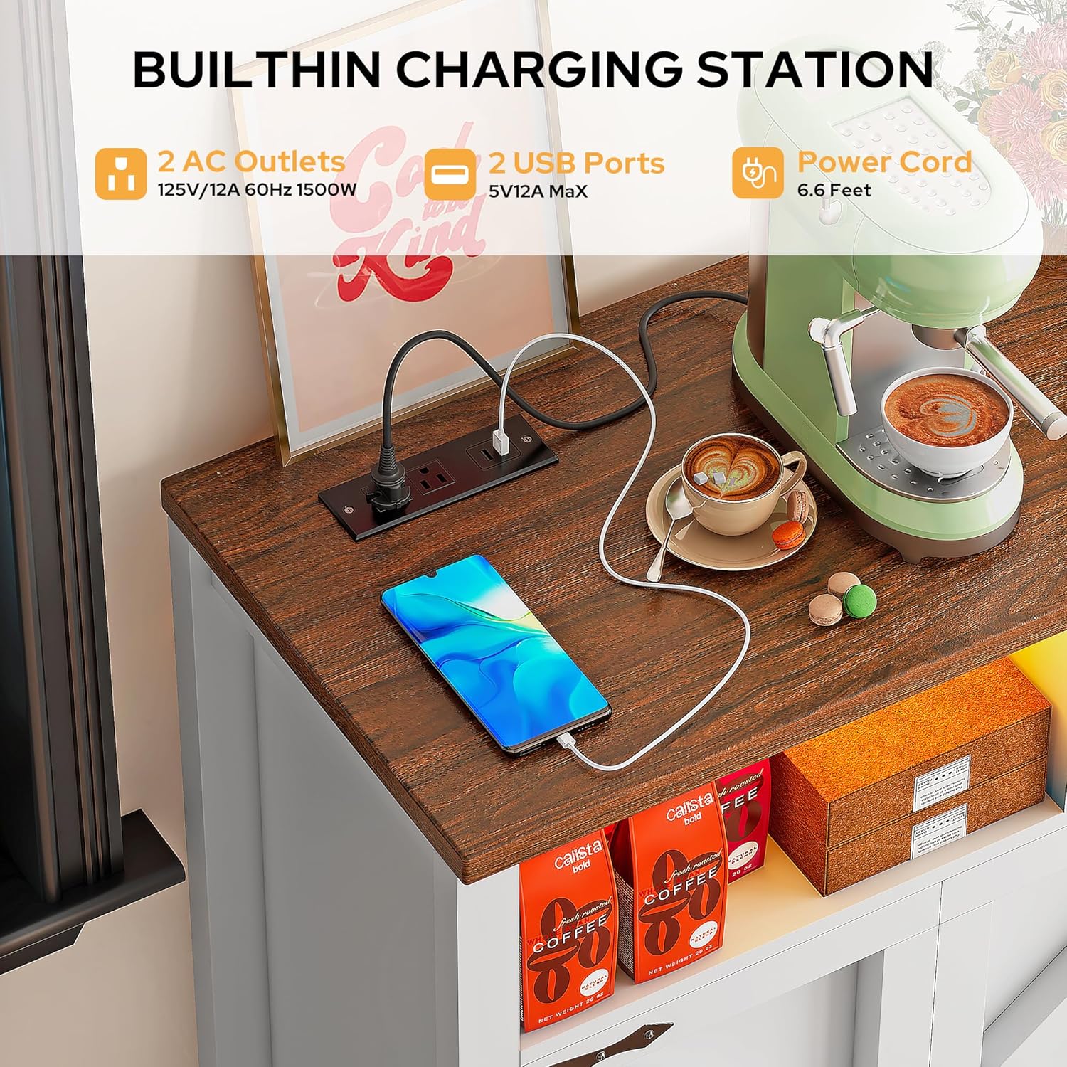 - Multi-Functional Integration - Buffet Cabinet with Charging Station: This Buffet Sideboard features a power outlet, which creates convenience for device charging. Led buffet cabinet has 2 AC outlets and 2 USB ports, so you can charge your coffee maker, microwave oven, bread machine, mobile phone and other small appliances without the need for an additional charger. That makes things so much easier for you if you don't have many outlets in your room.