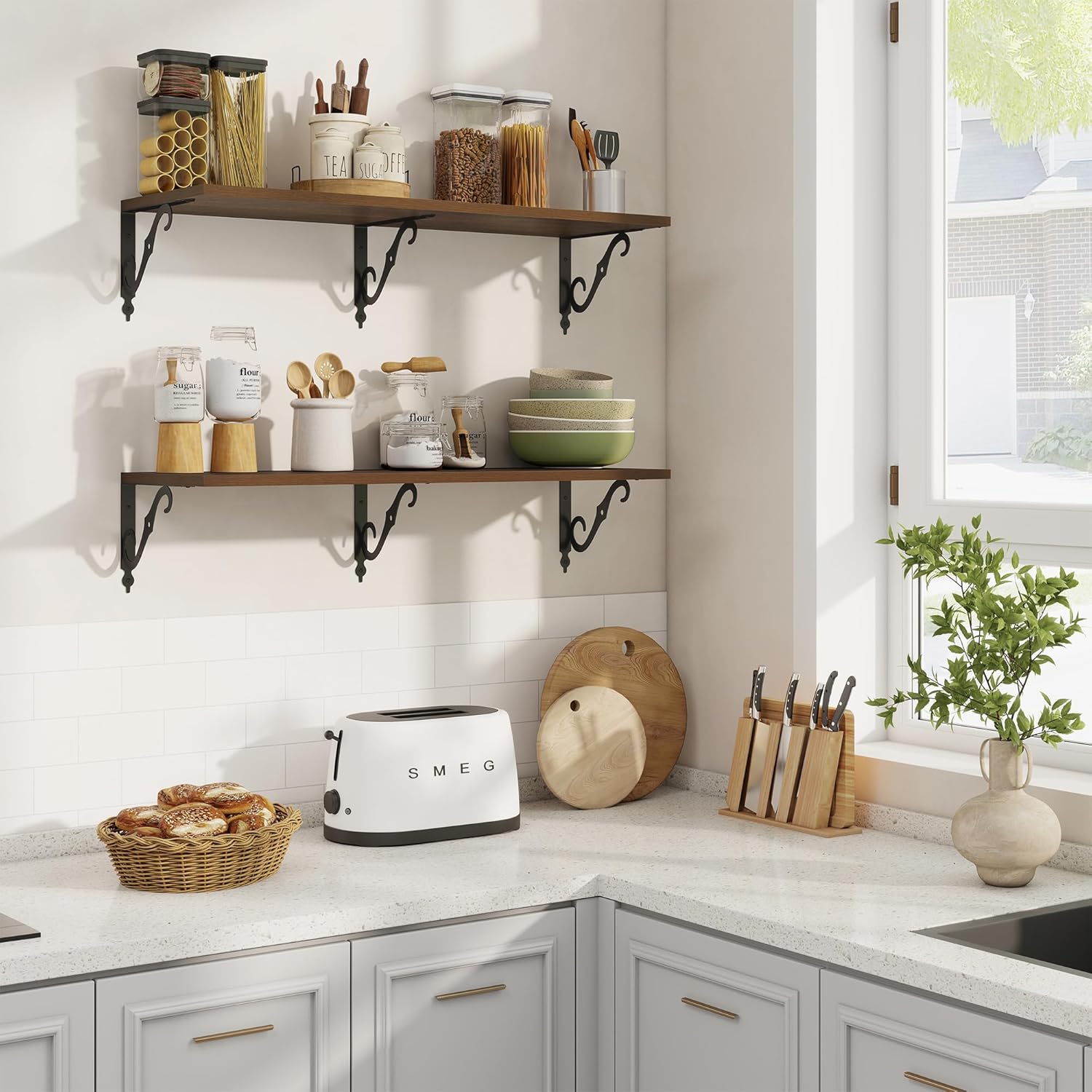 - 12 Inch Deep Floating Shelves: Our rustic deep floating shelves are made of high-quality particle board and sturdy brackets. The classic S-shaped brackets are designed to prevent sagging and ensure long-lasting stability. All edges are carefully sanded for a smooth finish