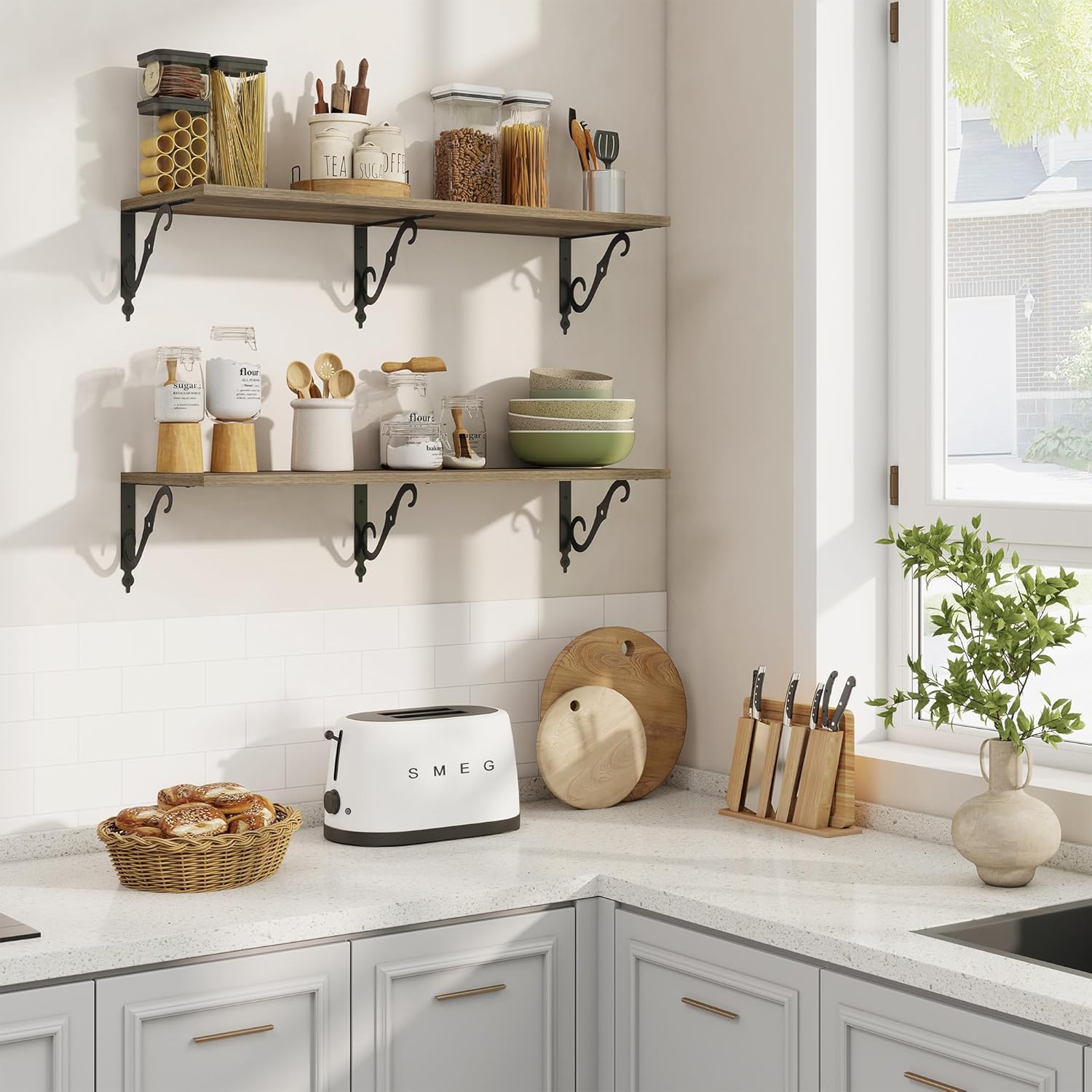 - 12 Inch Deep Floating Shelves: Our rustic deep floating shelves are made of high-quality particle board and sturdy brackets. The classic S-shaped brackets are designed to prevent sagging and ensure long-lasting stability. All edges are carefully sanded for a smooth finish