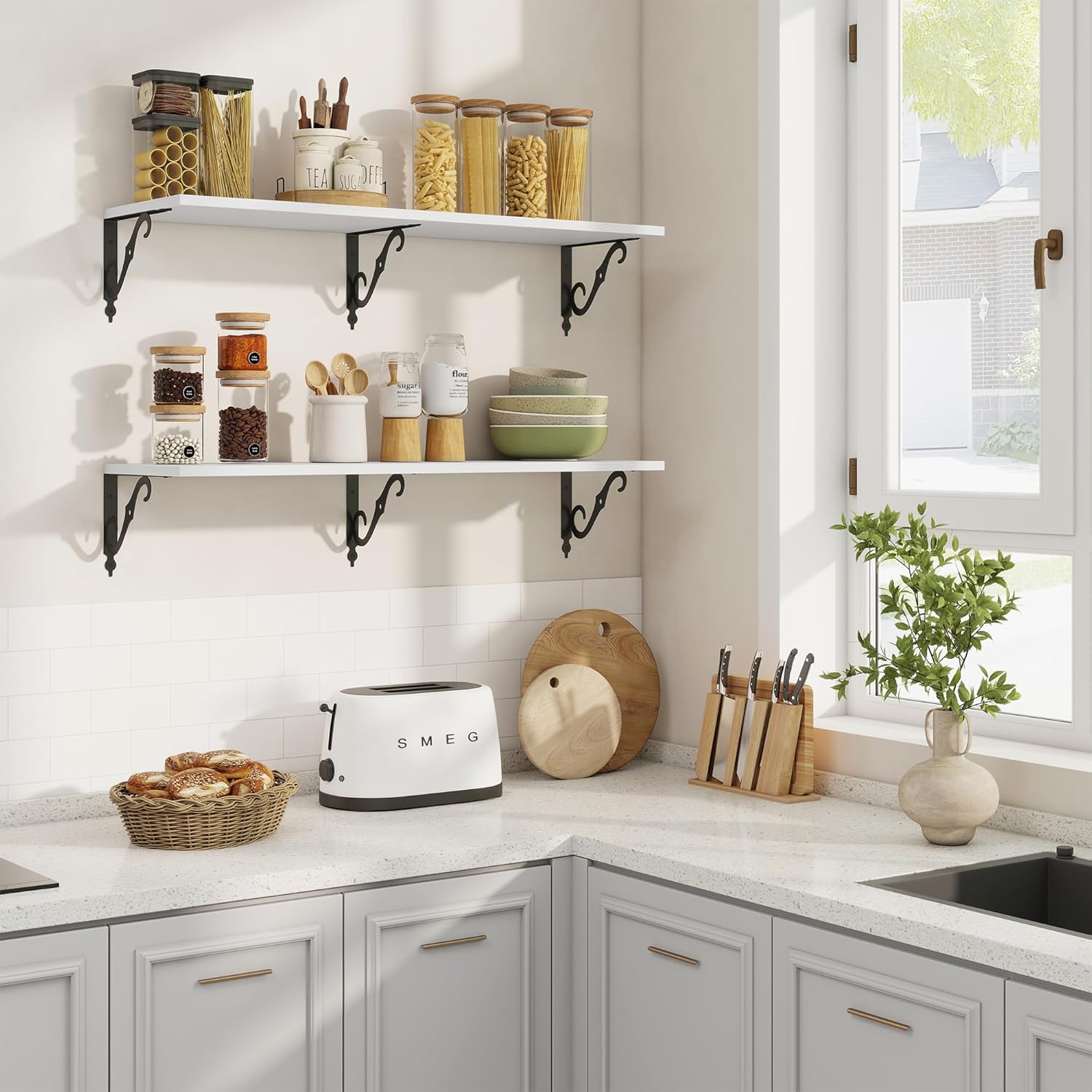 - 12 Inch Deep Floating Shelves: Our rustic deep floating shelves are made of high-quality particle board and sturdy brackets. The classic S-shaped brackets are designed to prevent sagging and ensure long-lasting stability. All edges are carefully sanded for a smooth finish
