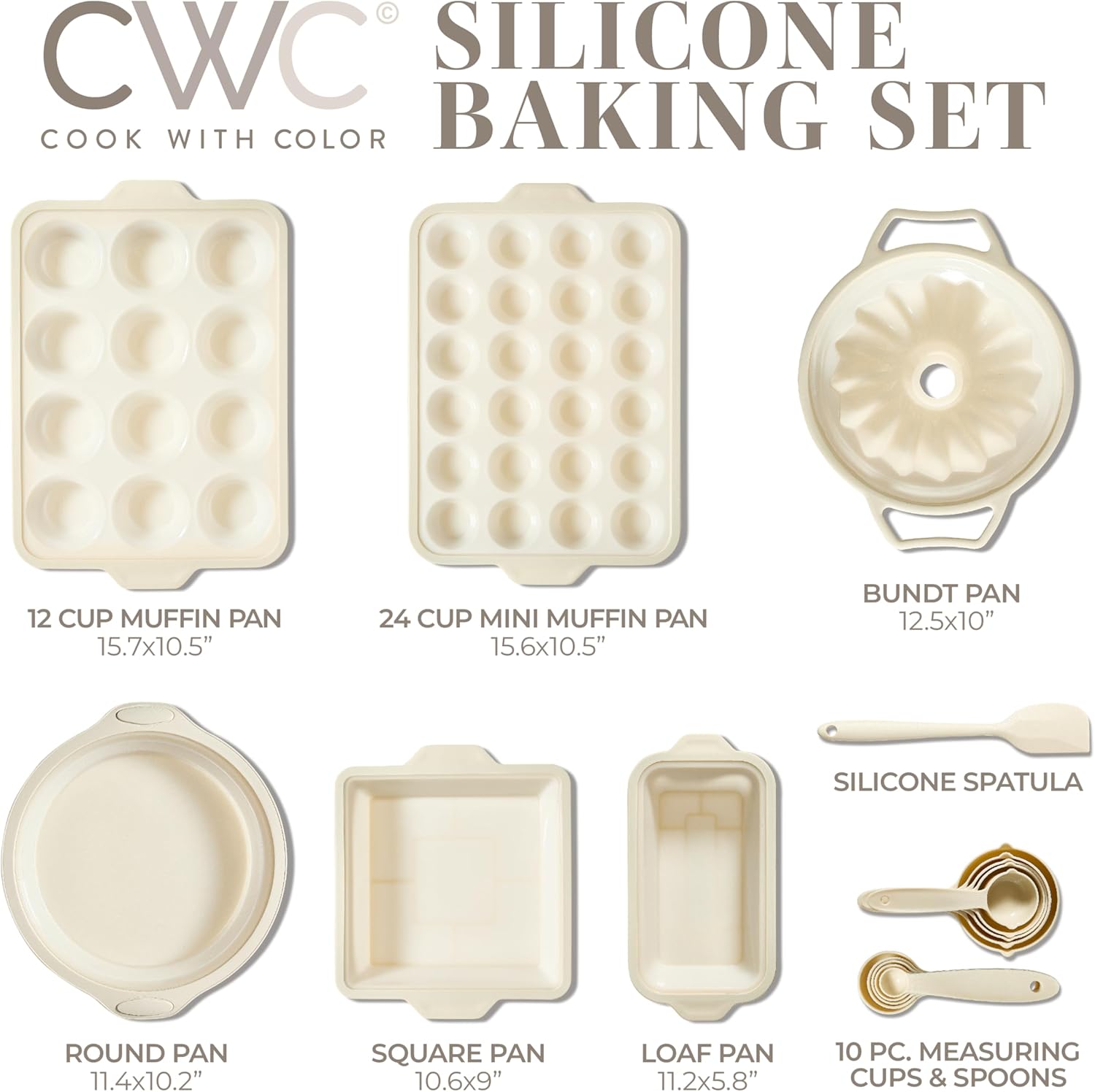 - Complete Baking Set: This silicone baking set with silicone bundt pan, comes with everything you need. It's the perfect addition for bakers looking to expand their silicone bakeware collection. Includes: 12 cup silicone muffin pan, 24 cup mini muffin pan, bundt pan, round cake pan, square pan, loaf pan, silicone spatula and measuring cups and spoons.