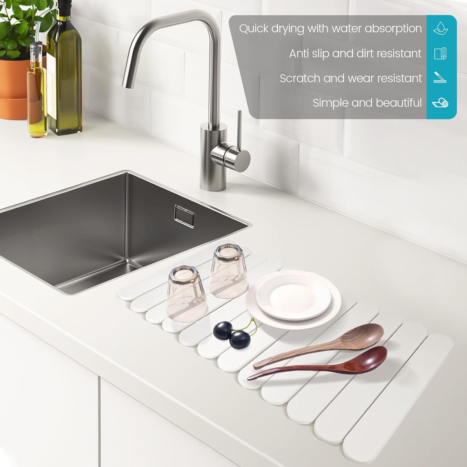 - Collapsible and Space-Saving: Measuring 28"(L)x16"(W) when unfolded, this collapsible stone drying mat offers ample space for your dishes. When not in use, easily store it in drawers or kitchen cabinets, maximizing your kitchen's organization