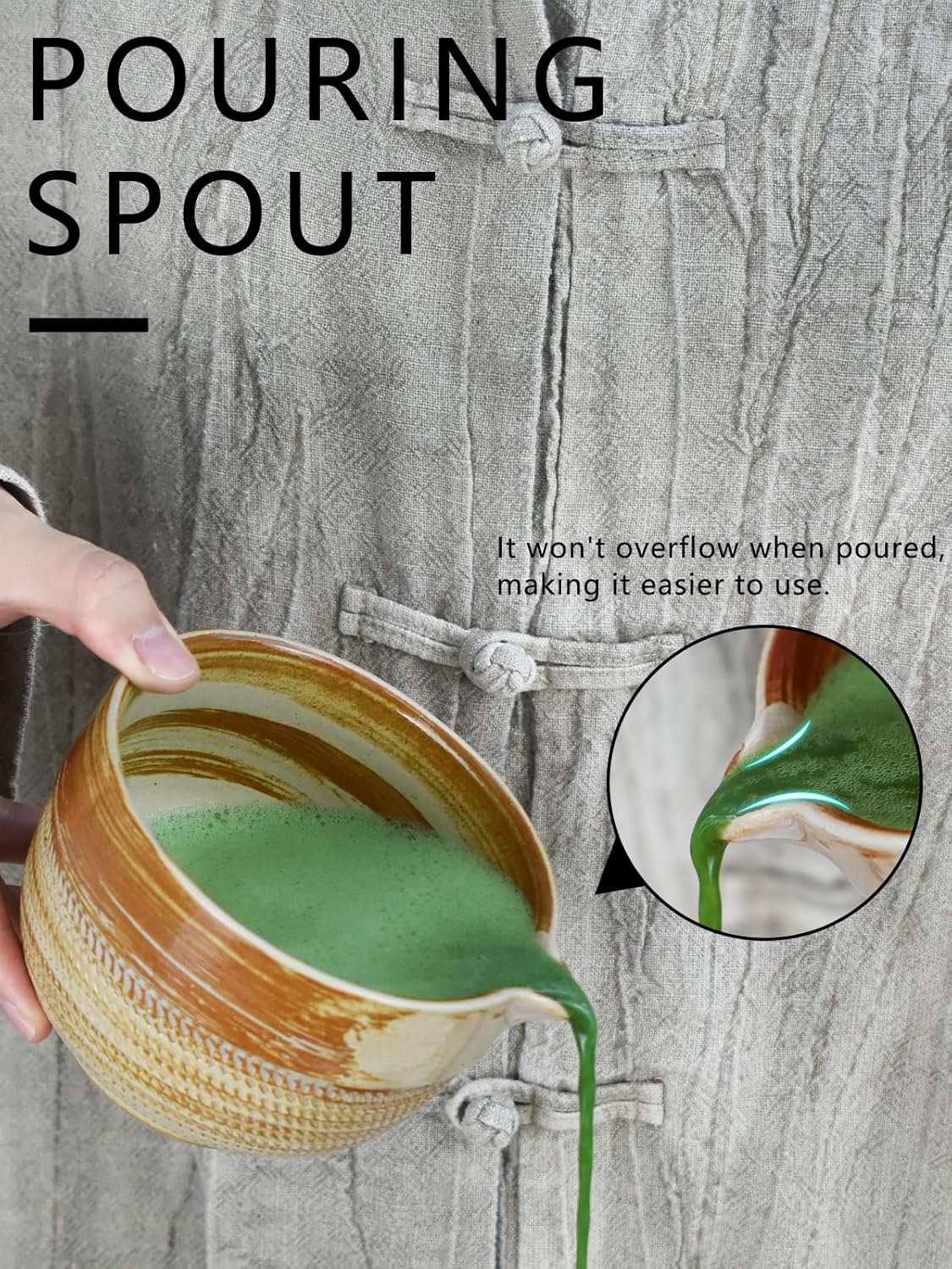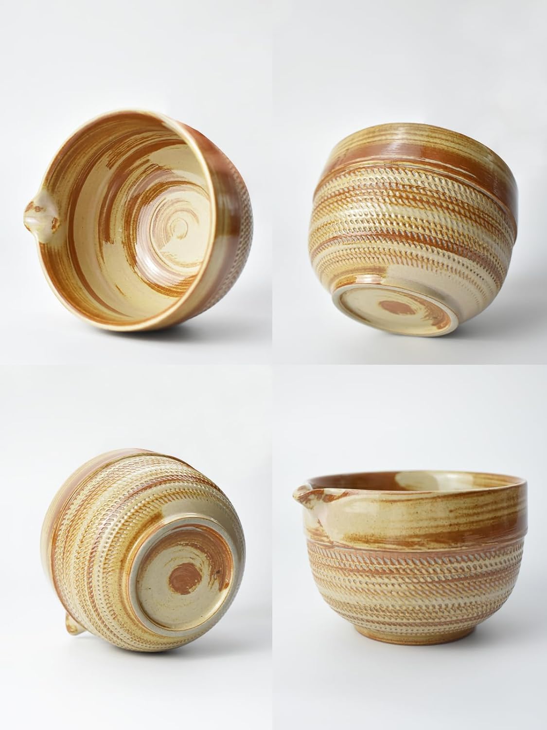 - Handcrafted Ceramic Bowl with Pouring Spout: The matcha bowl features a warm beige base accented with earthy brown glazing, evoking a natural, grounded aesthetic. The integrated spout ensures smooth pouring, combining form and function for a mindful tea experience.