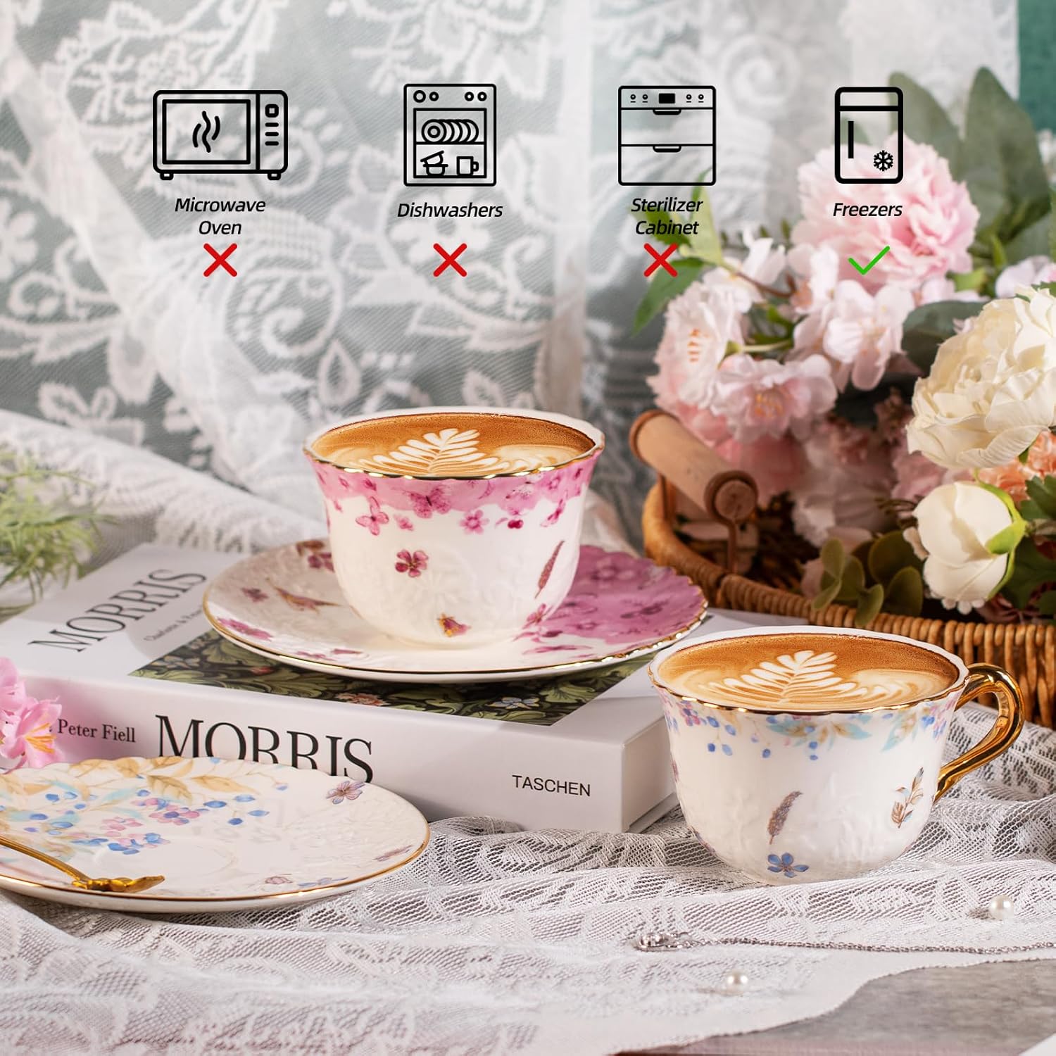 - High-Quality Porcelain: Made from durable porcelain, these tea cups and saucers are designed to withstand daily use while providing excellent heat retention, ensuring your beverages stay warm longer.