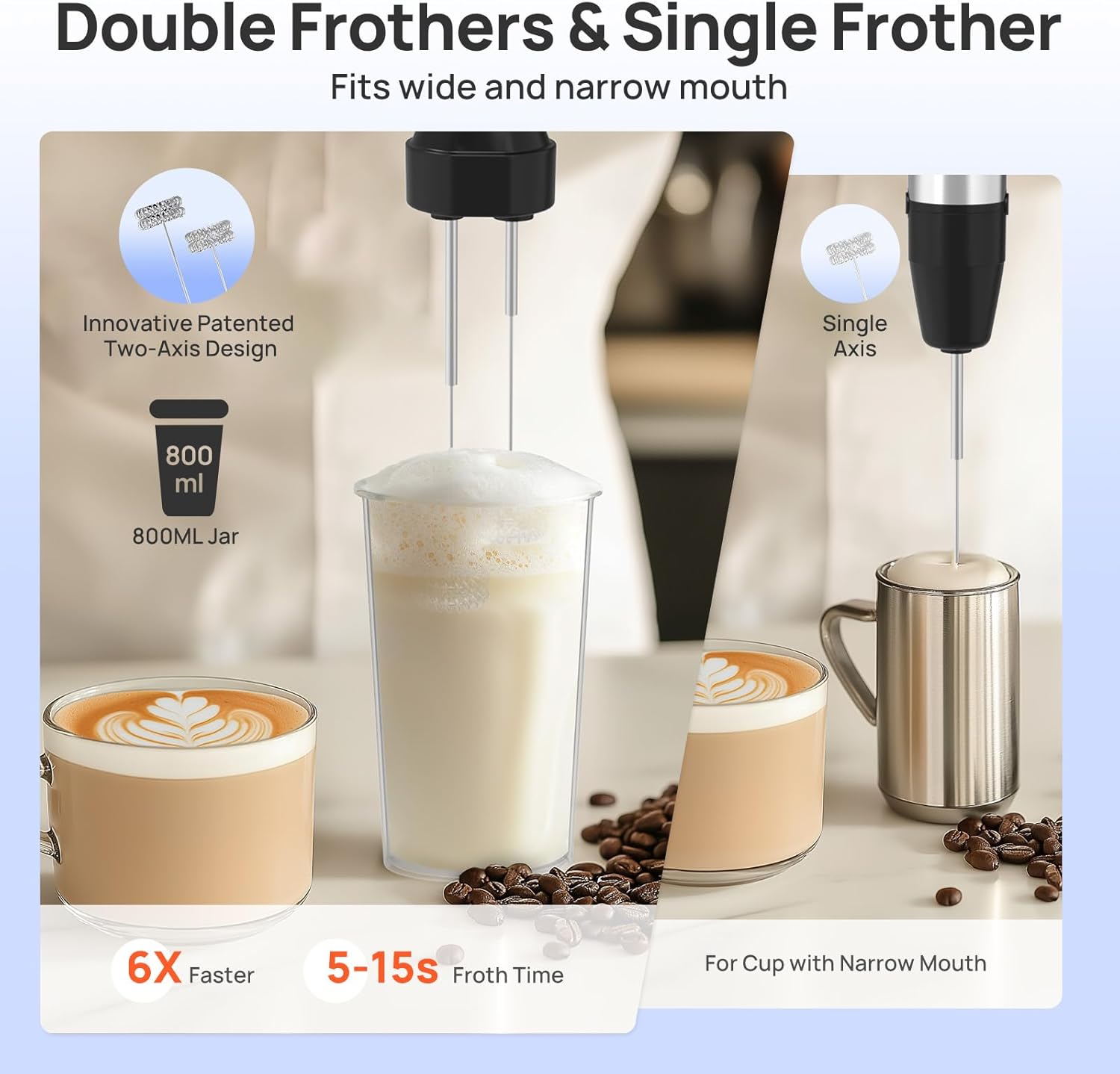 - 【3 Dual Drive Shaft Attachments】 - The innovative dual shaft design allows for faster and more thorough blending. /Double Frothers/ Froths 200ml of milk in just 5-15s, 6x faster than others; /Double Beaters/ 4x faster to whip eggs. Even function as hand mixers for batter, dough, and other heavy mixtures; /Double Hooks/ Kneading thick bread or pizza doughs and mixing batter without the effort
