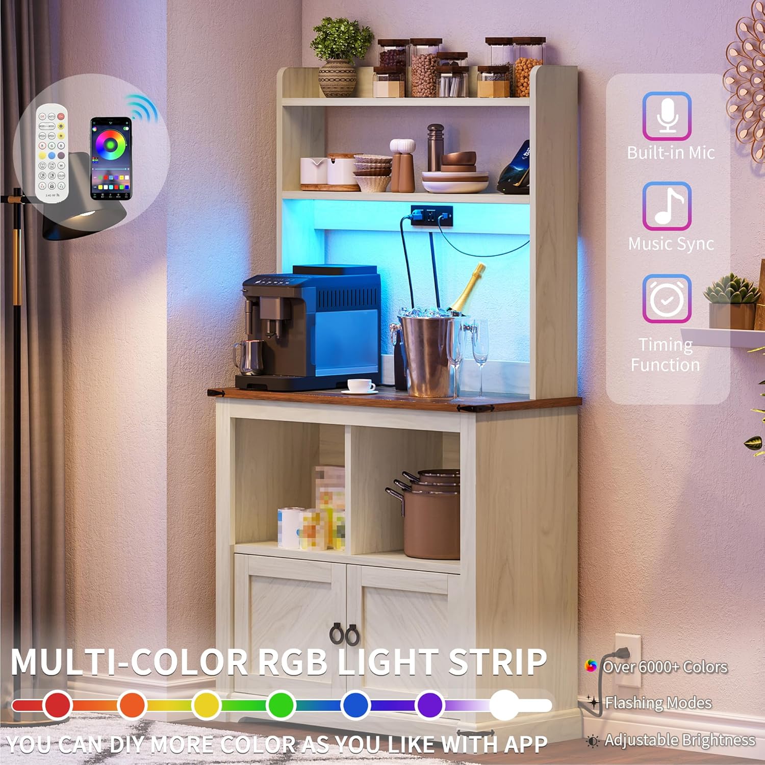 YITAHOME Bakers Rack Cabinet, Microwave Stand with Power Outlet & RGB LED Lights, Farmhouse Coffee Bar Station with Storage, 5-Tier Kitchen Pantry Hutch for Dining Living Room,White Walnut Grain