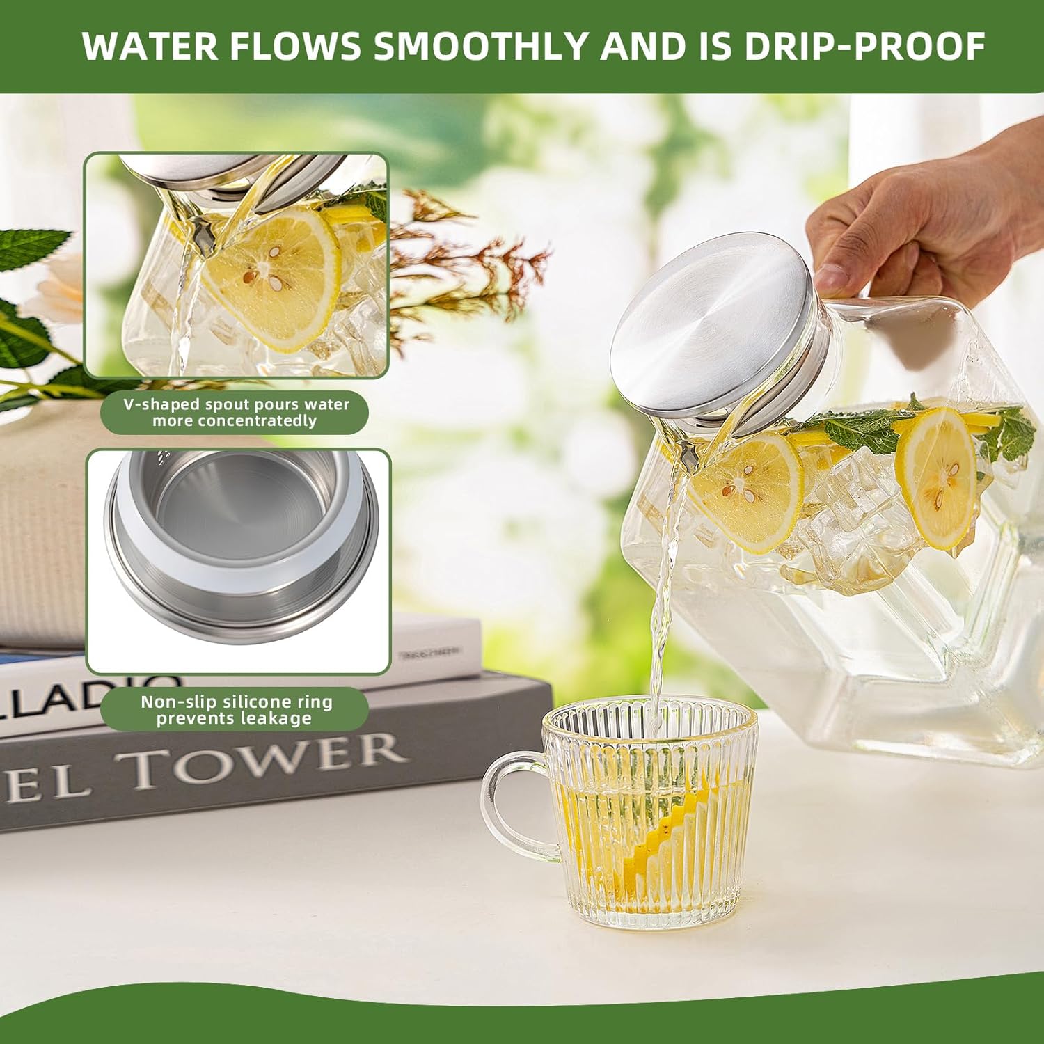 - [Anti-drip Spout & Reinforced Handle]: With its V-shaped spout, this pitcher is designed to minimize spills during pouring. The enhanced ergonomic handle, thicker and wider, ensures easier and more comfortable pouring.