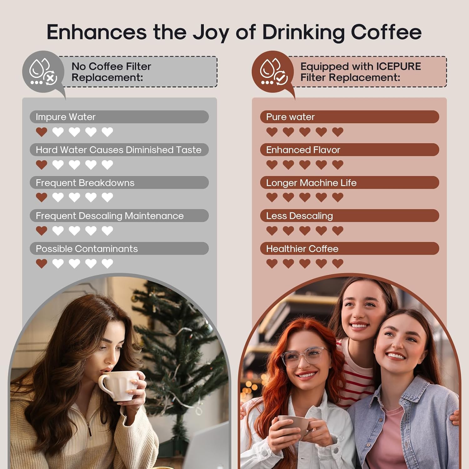 - Improve the Flavor-This ICEPURE CMF008 coffee water filter compatible with breville espresso machine filters, features a three-layer filtration structure, which expands the surface adsorption area, enhances the filtration efficiency, softens water quality, effectively improves water quality, enhances the flavor of coffee, significantly improves the taste of coffee, and creates the most delicious coffee