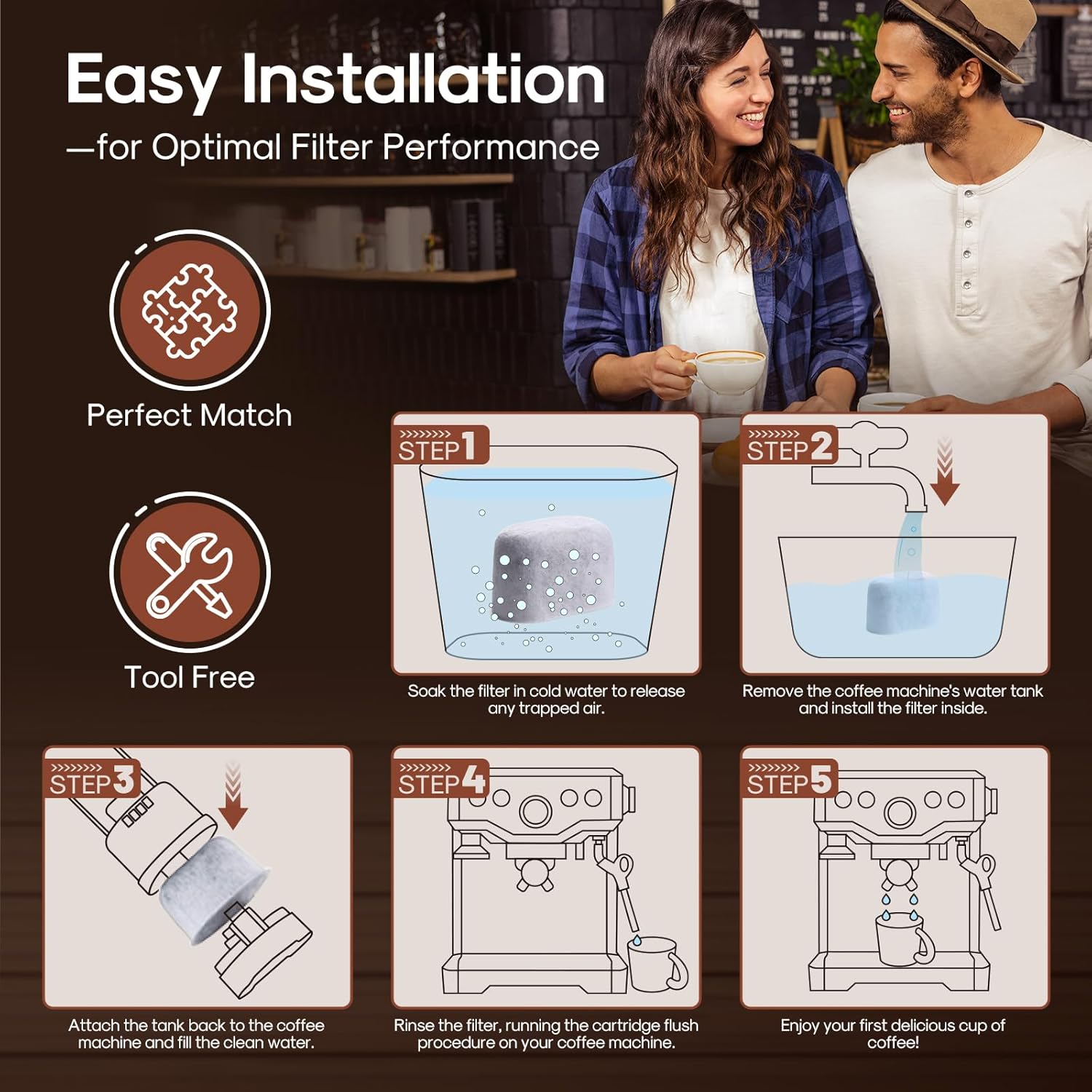 - High Quality Materials-These filters replacement for the Breville BWF100 espresso machine water filter. It is made of high-quality coconut shell activated carbon, which has a strong adsorption capacity and can remove chlorine, odors and impurities in water. While maximizing filtration, it ensures that your coffee machine will not be clogged