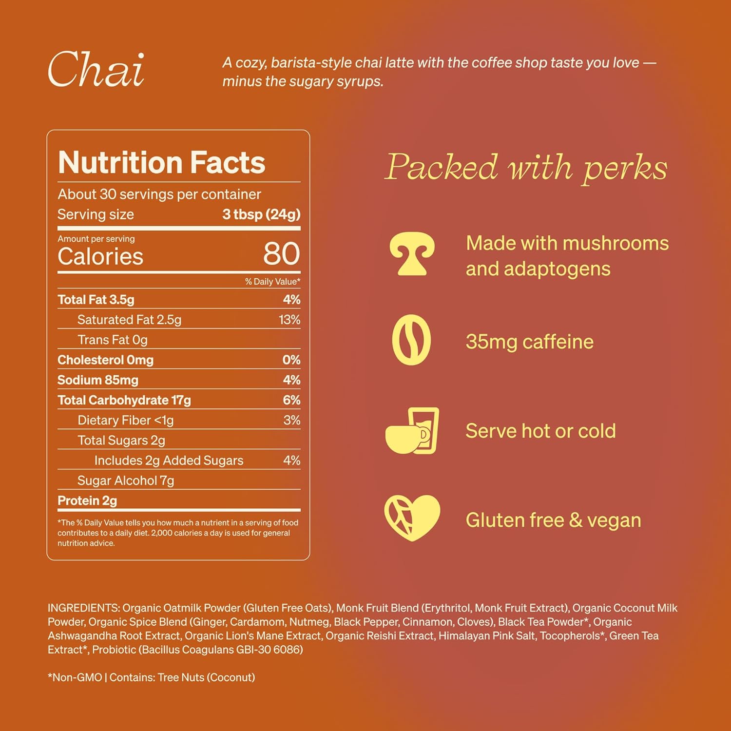 - FUNCTIONAL INGREDIENTS: Our chai latte features a science-backed blend of adaptogens, mushrooms and probiotics. Probiotics support gut health while our blend of adaptogens and mushrooms (including Organic Lion’s Mane, Reishi & Ashwagandha) promote energy, a positive attitude, and overall health.