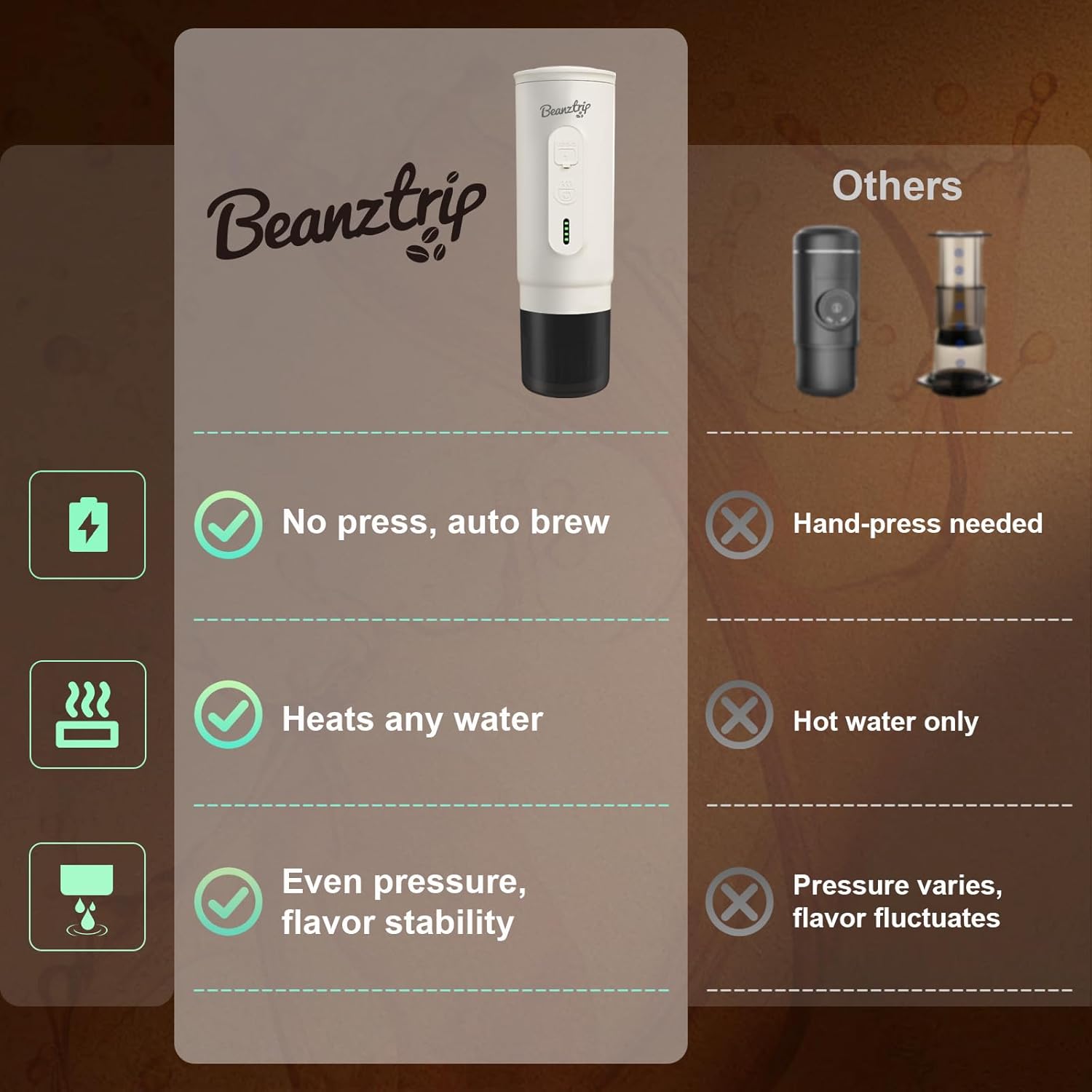 - Lightweight & Portable - Beanztrip portable espresso maker weighs only 1.4 lb and measures 2.8” x 2.8” x 9.1”; with the detachable structure design, each component can be easily disassembled and washed(the main unit is not washable), making it more convenient for you to carry and enjoy pure coffee anytime