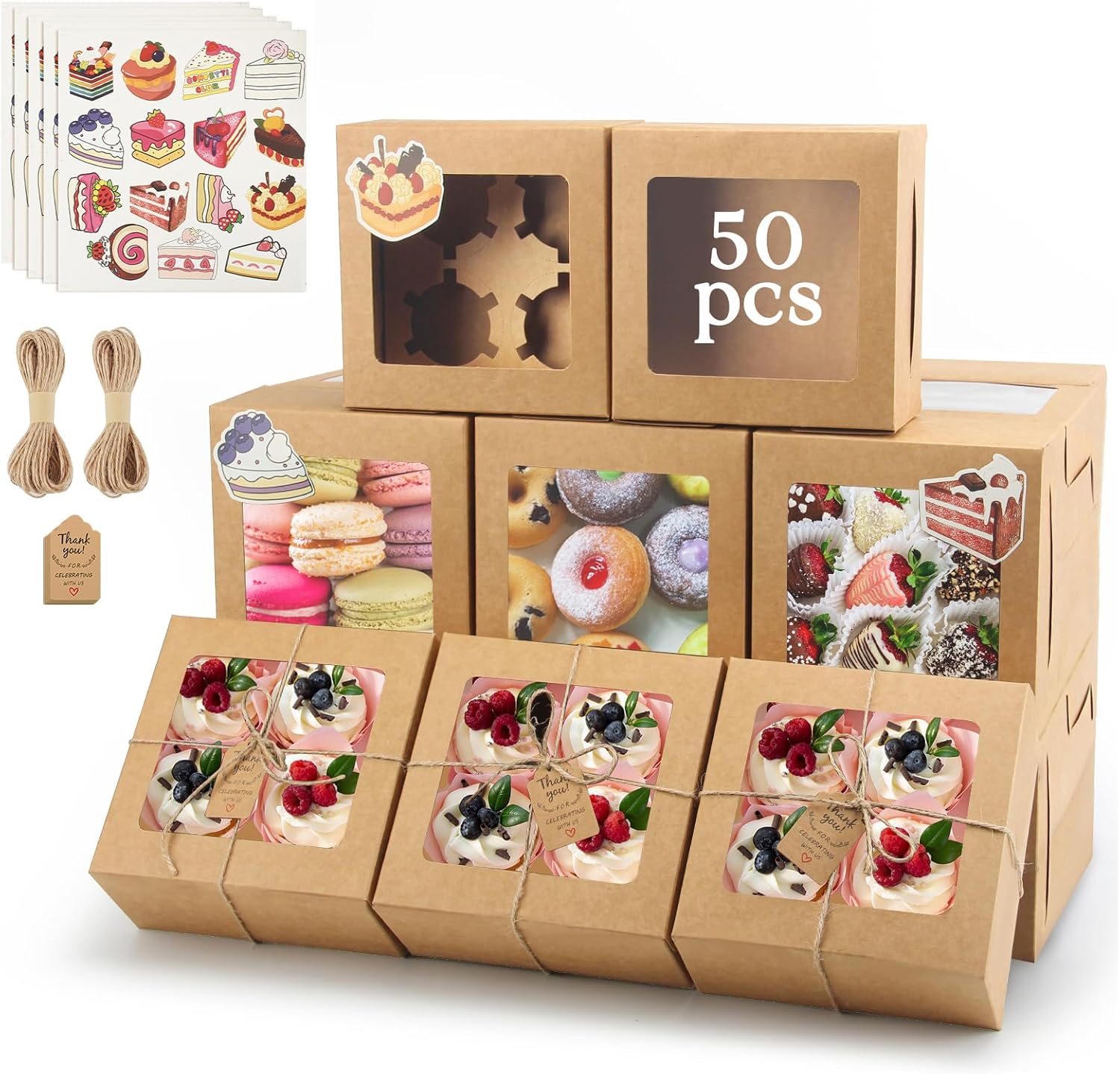 - [Cake Stickers and Twine for Personalization] Comes with assorted cake-themed stickers and natural jute twine so you can add a personal touch to each cupcake box. Create charming, customized packaging that delights your customers, friends, and family.
