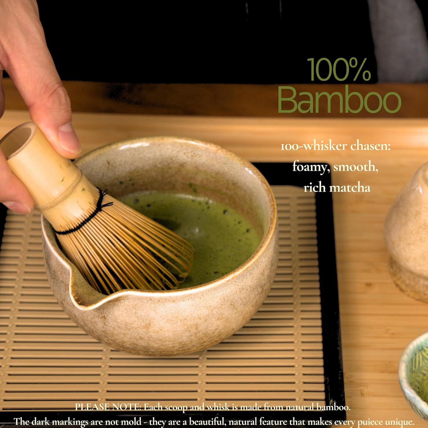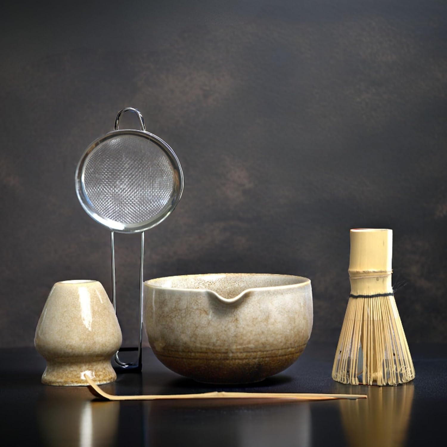 - đ§ââïžăYour Daily Matcha Ritual, All in One Setă This 5-piece matcha tea set has everything you need to create smooth, cafĂ©-style matcha at homeâwhether youâre a daily drinker, just getting started, or curious about traditional Japanese tea rituals. Includes: 1Ă Matcha Bowl with spout, 1Ă Bamboo Whisk (Chasen), 1Ă Whisk Holder, 1Ă Bamboo Scoop (Chashaku), 1Ă Stainless Steel Sifter.