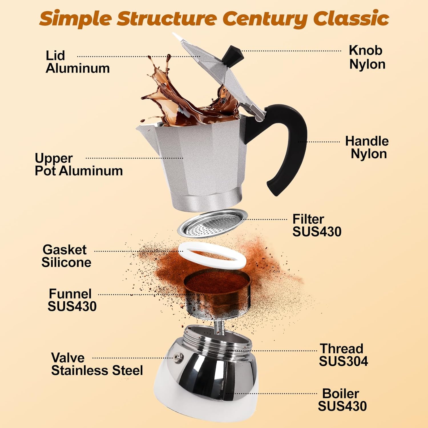 - Compatible with All Stovetops: Our stovetop espresso maker is suitable for any stove, such as gas, induction stove, ceramic stove, electric stove, alcohol stove and propane camping stove. You don't need to go out, you can easily make your favorite lattes, mochas, smoothies, macchiatos and cappuccinos,. We use high quality ingredients to make the extraction hole to mellow the coffee and bring high quality coffee to you to enjoy