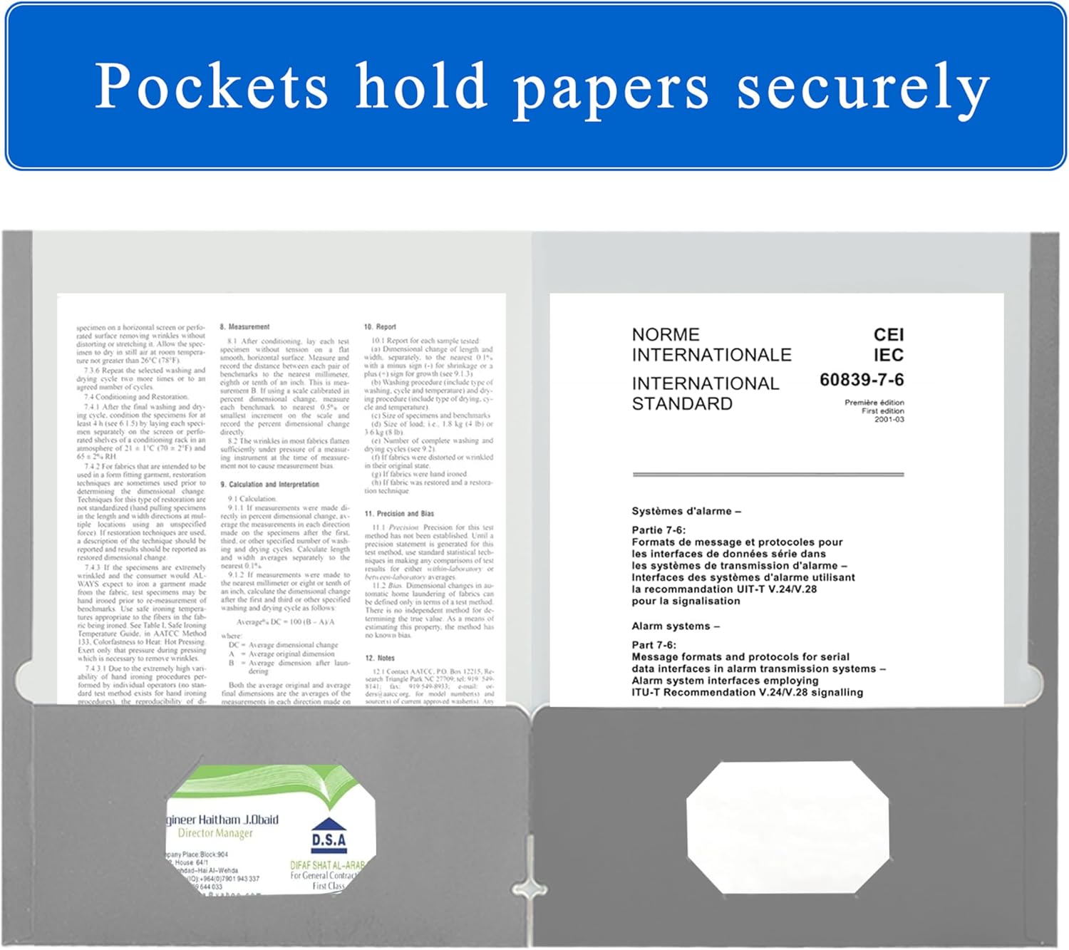 - PROFESSIONAL DESIGN: Two pockets provide storage space for paper, brochures, and more. Each folders for documents measures 9" x 11.5", with two 4" pockets, holds (over 100) sheets of paper, and has a universal business card holder on the right pocket.
