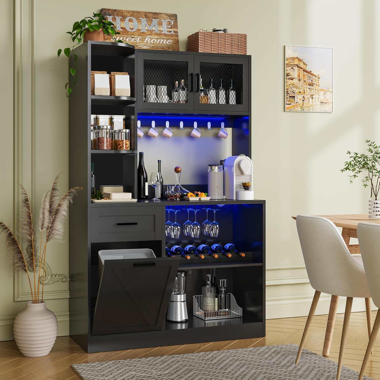 67.3" Tall Modern Black Kitchen Pantry Storage Cabinet with Drawer and Shelves, Tilt Out Trash Can, Coffee Bar Wine Cabinet with LED Lights and Power Outlet, Wine Glass Rack, 2 Mesh Doors