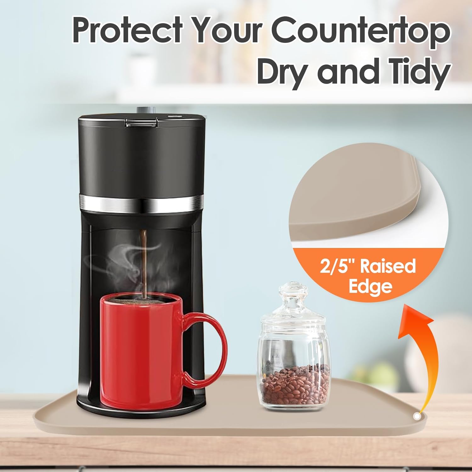 - 100% Water Does Not Flow Out: The coffee maker mat is built with 2/5" raised edge, like a tray and it can contain any liquid spills from the coffee maker. The premium material not only protect your countertop from scratches, especially protect the wood countertop, but also keep your your countertop tidy, clean.