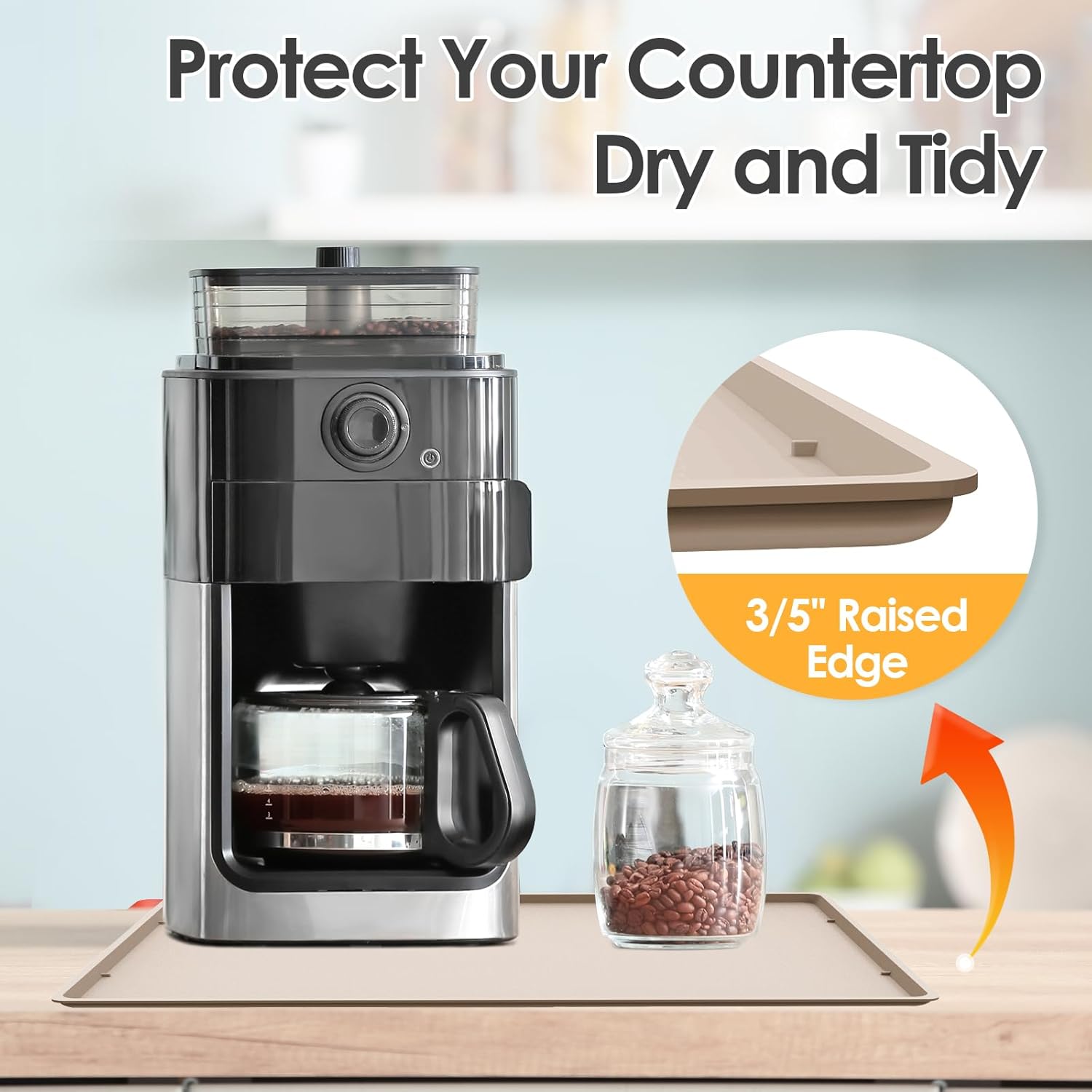 Silicone Coffee Maker Mat with Lip, 19.7'' x 15'' Heavy Duty Coffee Maker Mat for Countertops, Coffee Tray Fit Under Coffee Machine Appliance Automatic Machines Espresso Accessory, Khaki