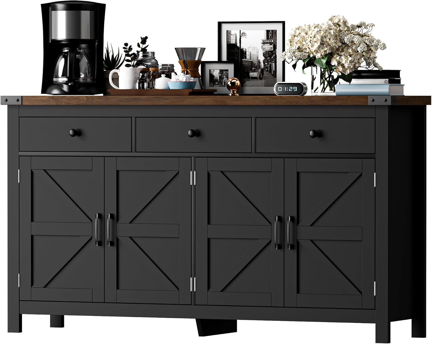 63" Sideboard Buffet Cabinet with Storage, Coffee Bar with 3 Drawers and 4 Barn Doors, Long Wider Storage Cabinet Modern Farmhouse, Black Wood, for Kitchen, Dining Room, Living Room