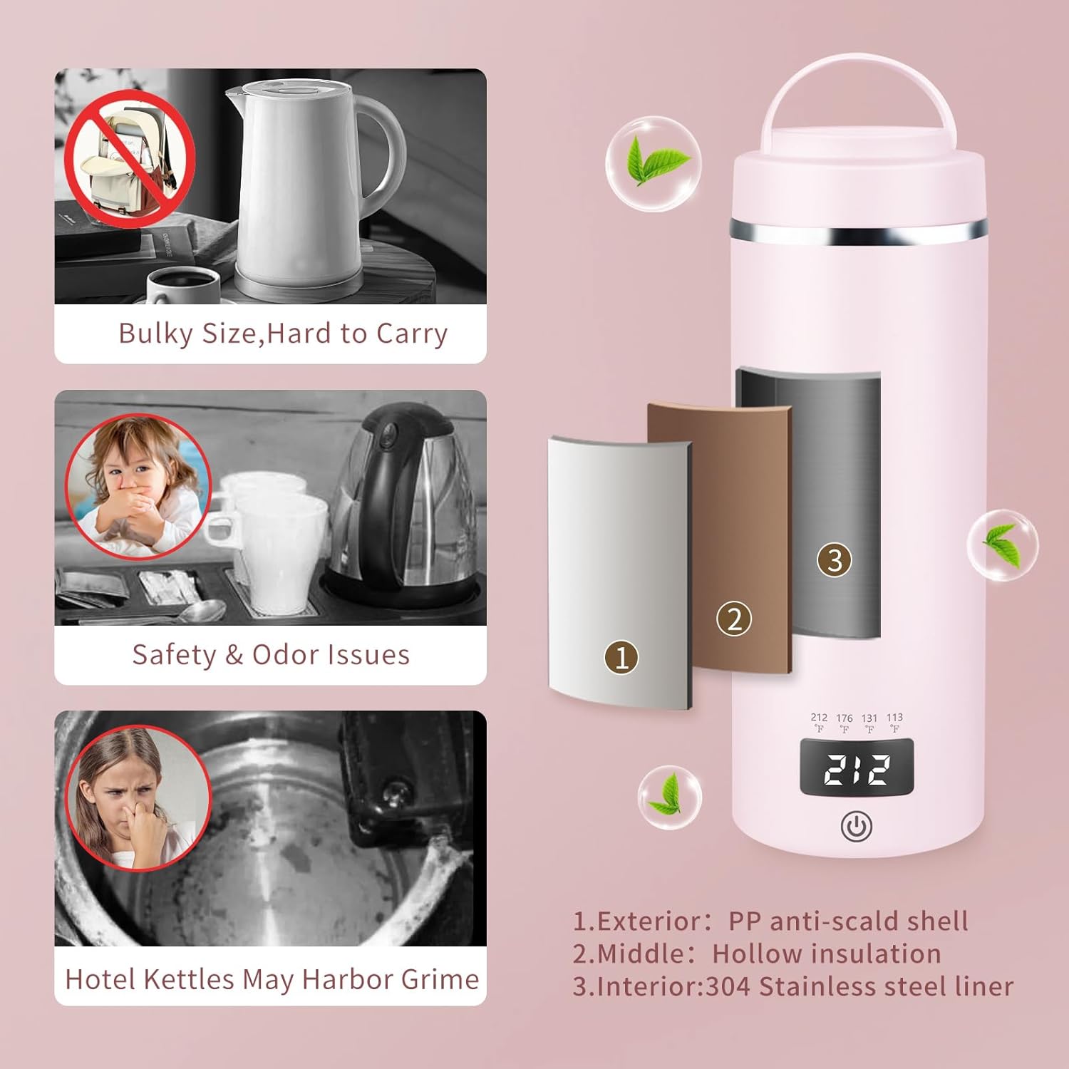 Travel Kettle Portable Electric Kettle with Plug-in Boiling & Keeps Warm via USB, Portable Water Boiler with 4 Temperature Settings, 304 Stainless Steel with Auto Shut-off 16oz(Pink)