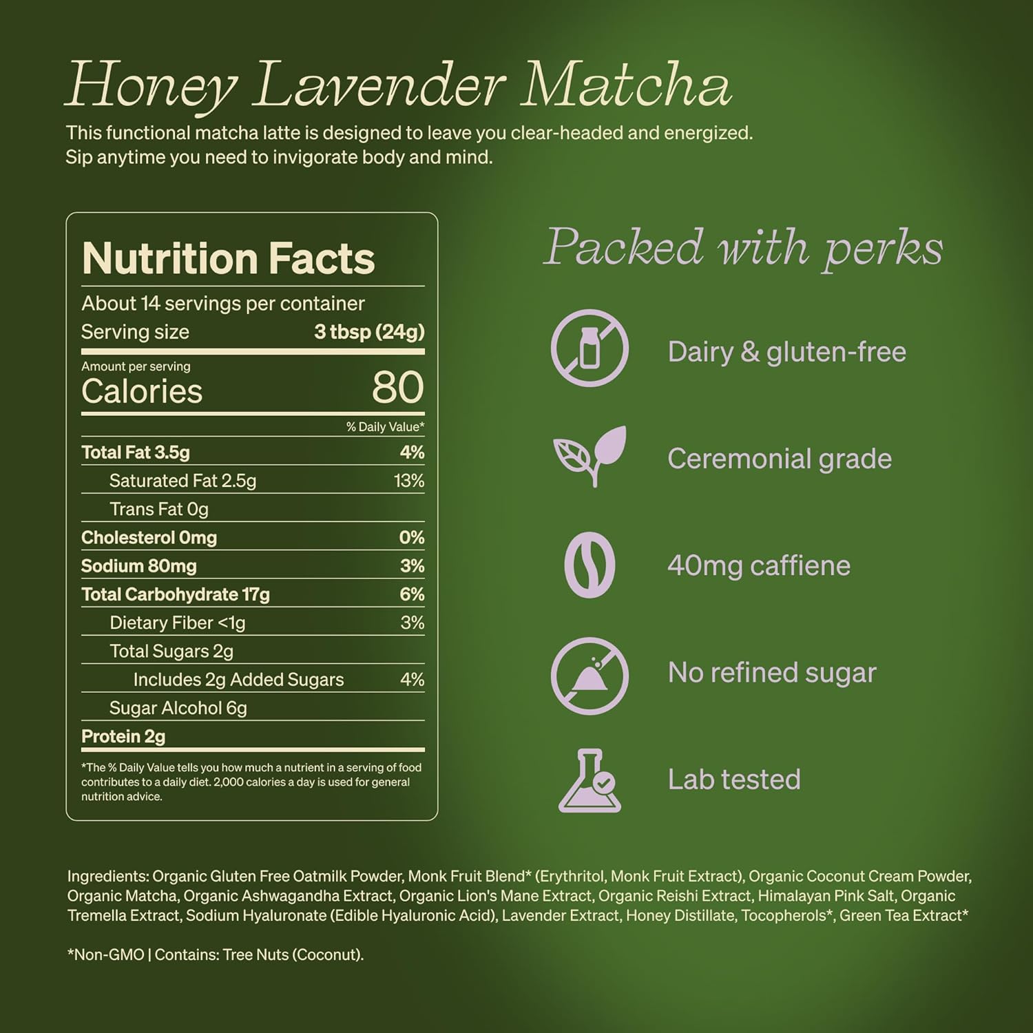 Clevr Blends Organic Honey Lavender Matcha SuperLatte, Instant Ceremonial Grade, Superfood Powder Blend, Oat Milk, Lion Mane, Reishi Mushroom, Coconut Cream, Ashwagandha, Serve Hot or Iced (14 Lattes)