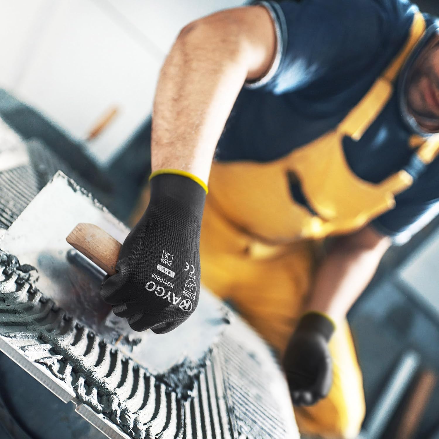 KAYGO Safety Work Gloves PU Coated,12 Pairs KG11PB Seamless Knit Glove for Men and Women, with Smooth Grip on Palm and Fingers, Ideal for General Duty Work (X-Small, Black)