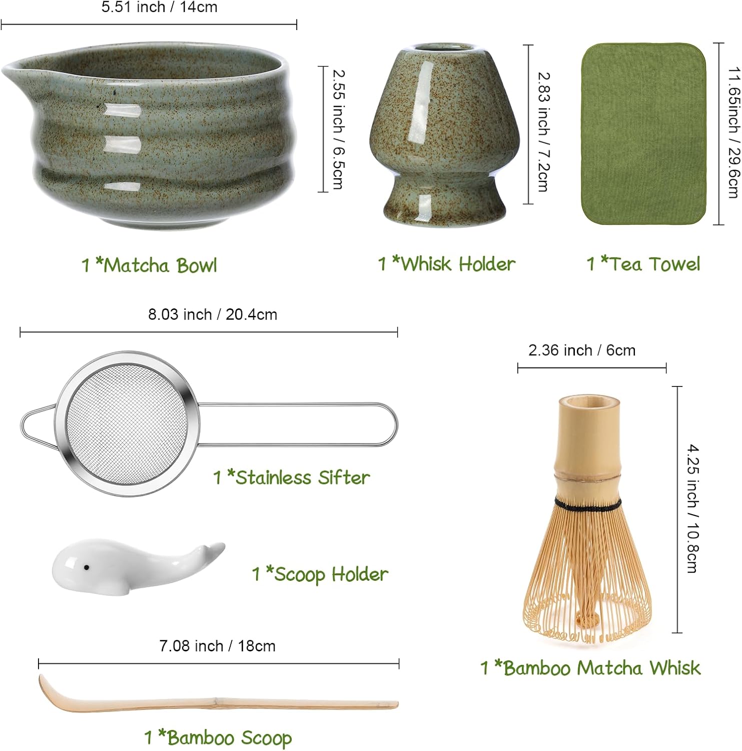 - 【7 Pcs Matcha Set】Complete 7-piece matcha ceremony set crafted with traditional aesthetics, our matcha whisk set include 1* ceramic matcha bowl (stoneware chawan) with spout for precise pouring, 1*bamboo whisk(chasen),1* ceramic whisk holder, 1*bamboo scoop (chashaku),1* dolphin-shaped scoop holder, and 1* stainless steel sifter, 1*Tea Towel, Perfect for recreating authentic Koicha/Usucha tea rituals.