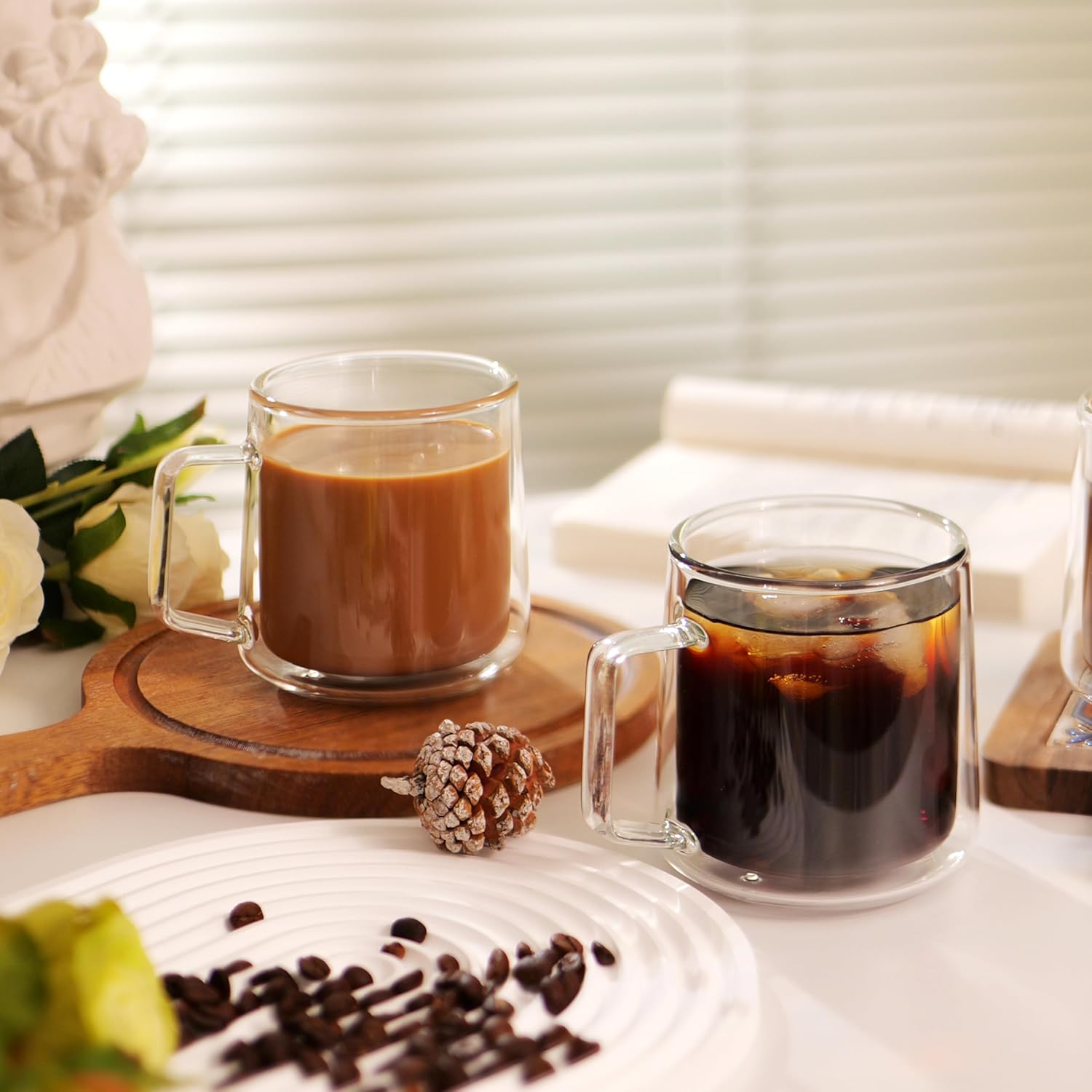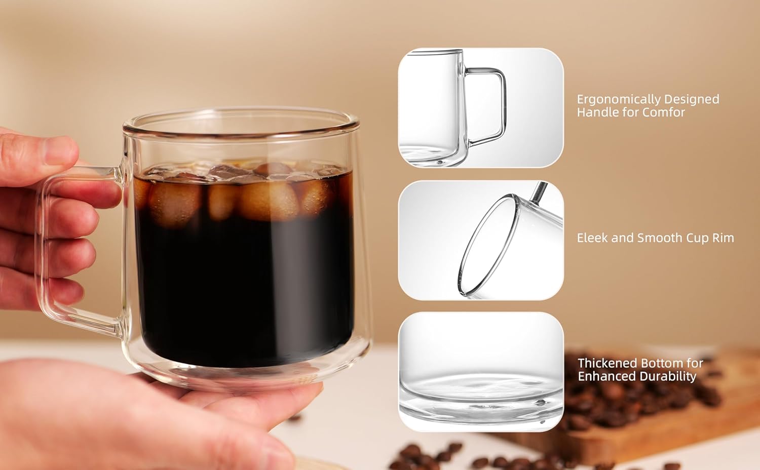 - Double-Walled Mug Design: Glass coffee cups are double-walled and have an excellent thermal insulation effect, which helps keep drinks cold or hot longer.