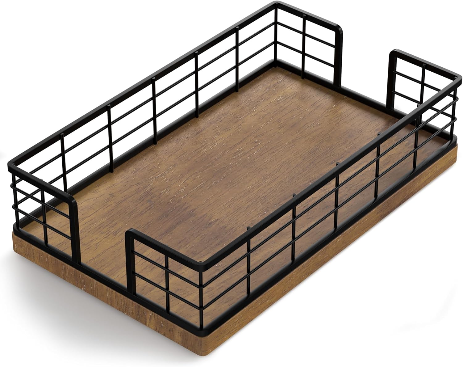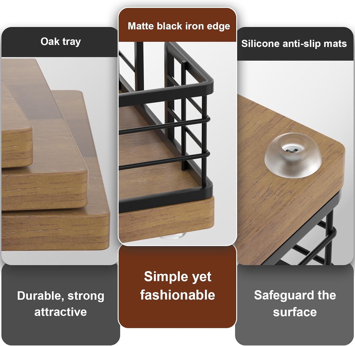 - Cost-effective: No assembly required, easy to clean. The tray crafted from iron and oak is simple and attractive. The solid bottom ensures items won't fall. With silicone non-slip pads, it provides both anti-slip functionality and better protection for surfaces