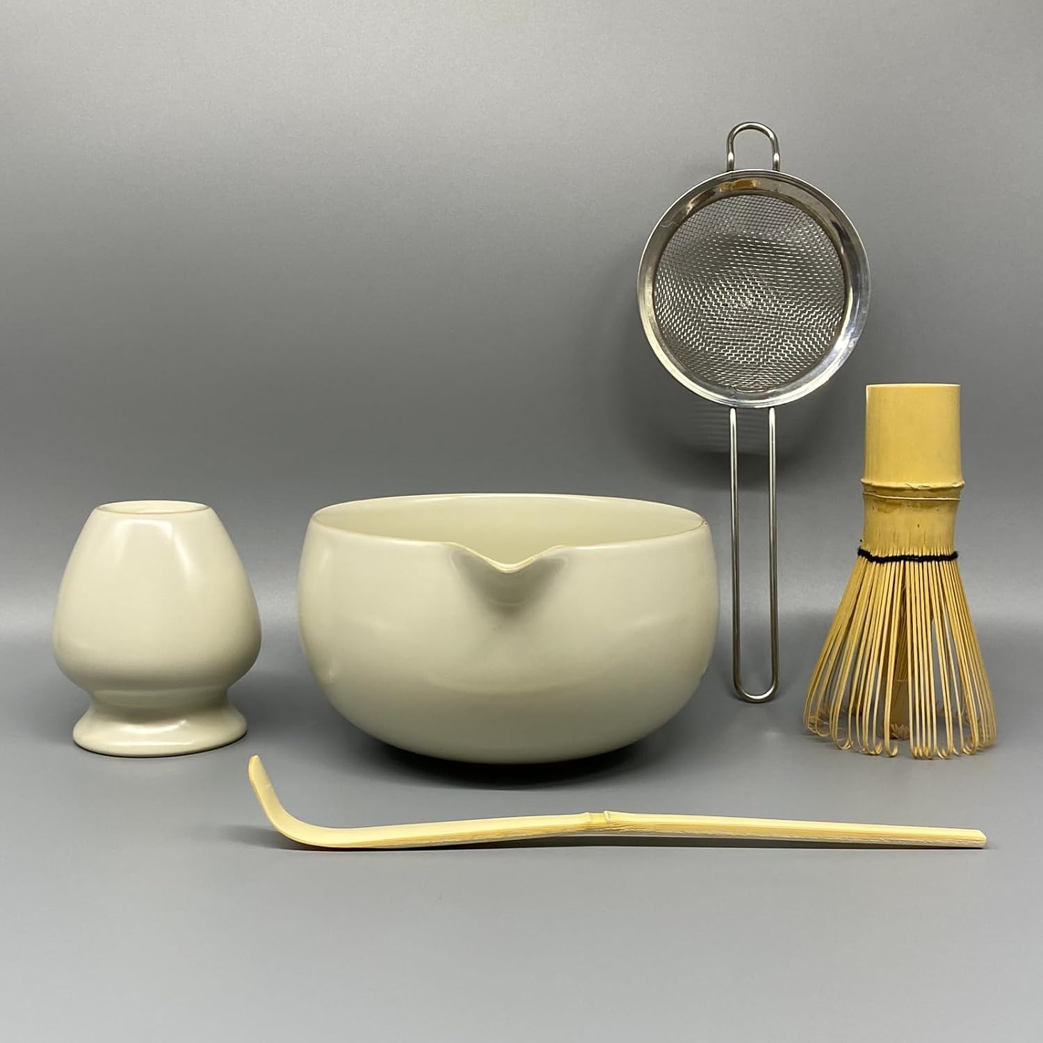 - 【5-Piece Matcha Set Whisk and Bowl Kit】 Includes 1*Ru Kiln matcha bowl with spout, 1*bamboo whisk, 1*ceramic whisk holder, 1*bamboo scoop, and 1*stainless steel sifter – everything you need to prepare authentic matcha at home or at the office.
