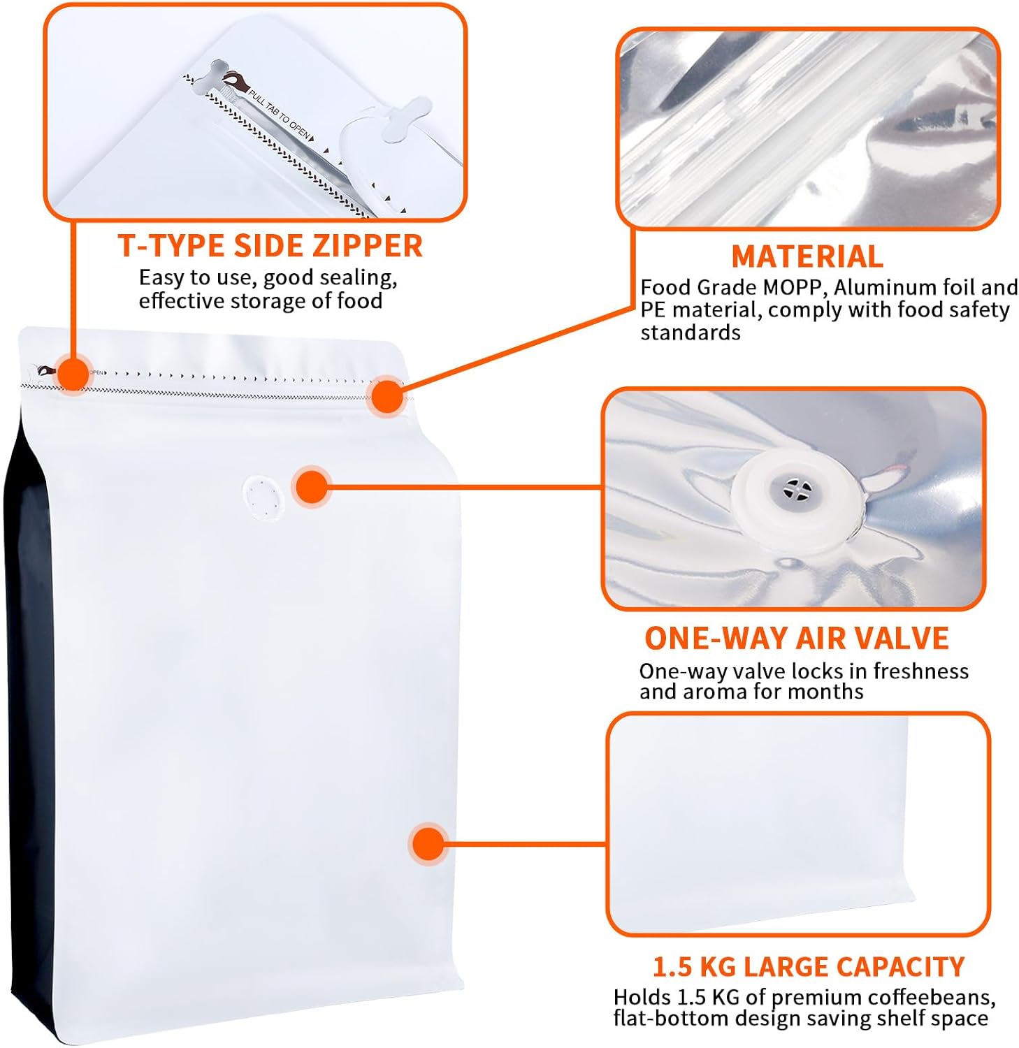 New 1.5 KG Large Capacity Coffee Bags with Valve (50 PCS) White Sides Black High Barrier Aluminum Foil Flat Bottom Standing Coffee Beans Storage Packaging Bags, Reusable Heat Seal Side Zipper Pouches