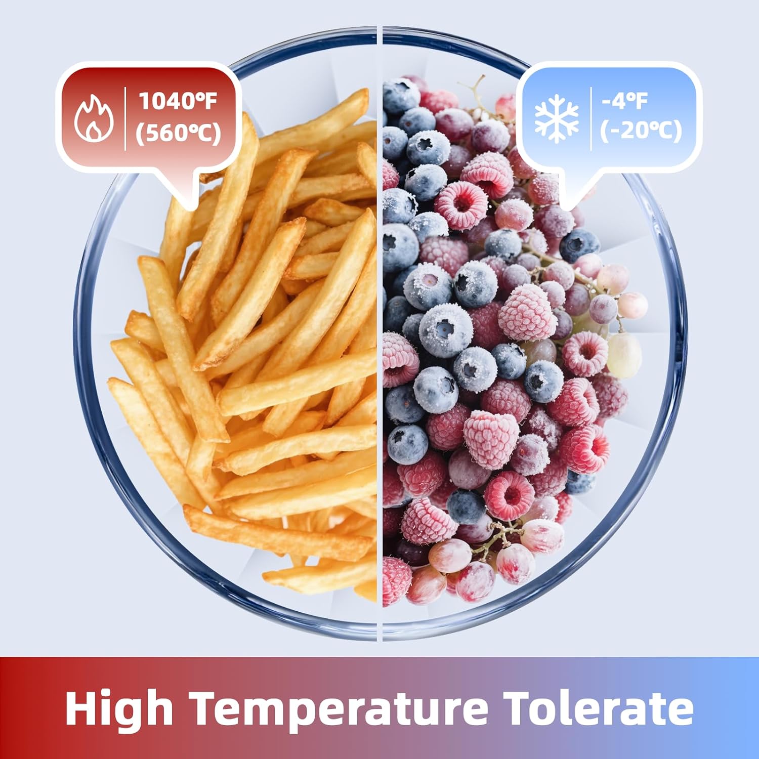 - 【Larger and More Capacity, Happier in Kitchen】These mixing bowls come in a set of 5 containing a variety of sizes (4.7qt,2.85qt, 1.69qt,1.11qt,0.85qt),these glass mixing bowl can meet all your purposes in kitchen. You can mix much salad, bread doughs, store holiday leftovers, dinner meal prep, reheat or cool food and so on. Using Tips: Most of the glass can not withstand the huge temperature difference, this is the characteristics of the glass material, please pay attention in daily use.