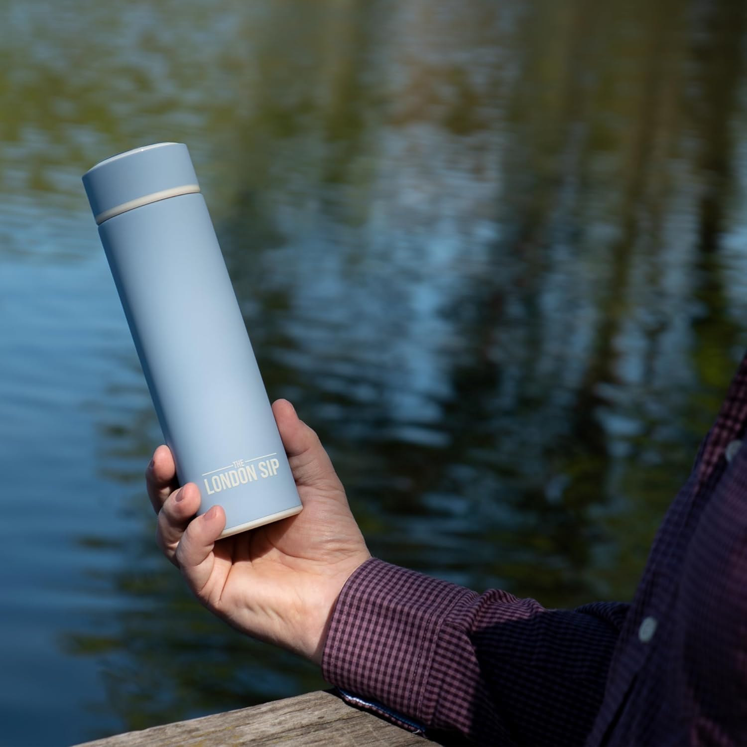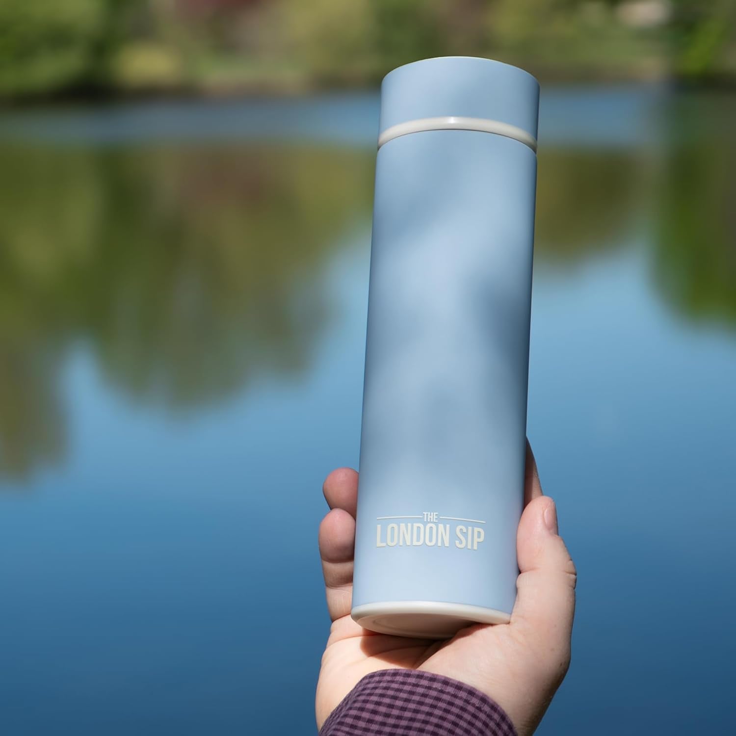 London Sip 16.9 oz Multi-Purpose Tea Infuser Mug – Fruit Infuser Water Bottle for Hot and Cold – Double Wall Stainless Steel Insulated, Blue Sunrise