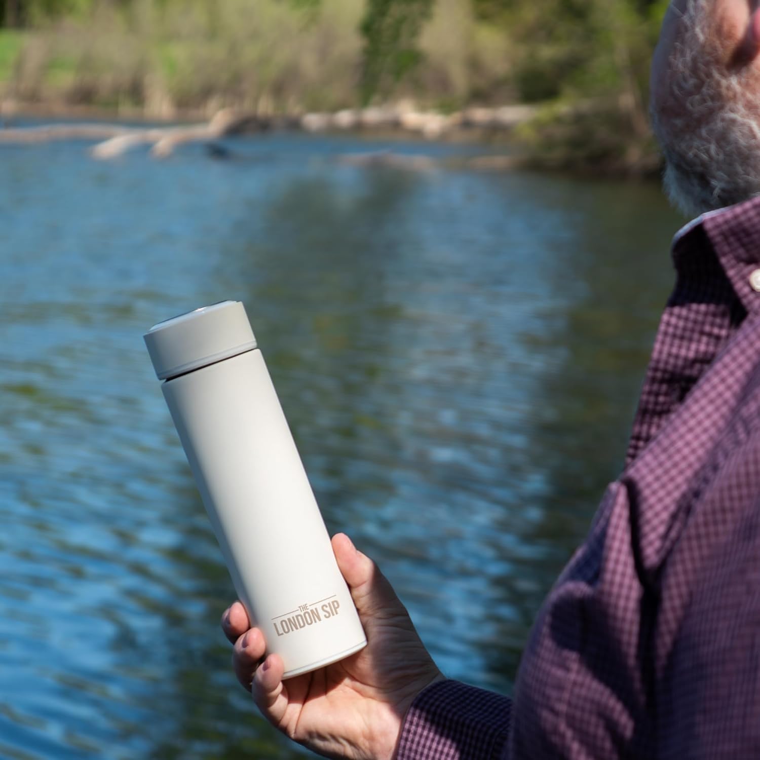 London Sip 16.9 oz Multi-Purpose Tea Infuser Mug – Fruit Infuser Water Bottle for Hot and Cold – Double Wall Stainless Steel Insulated, Pearl White
