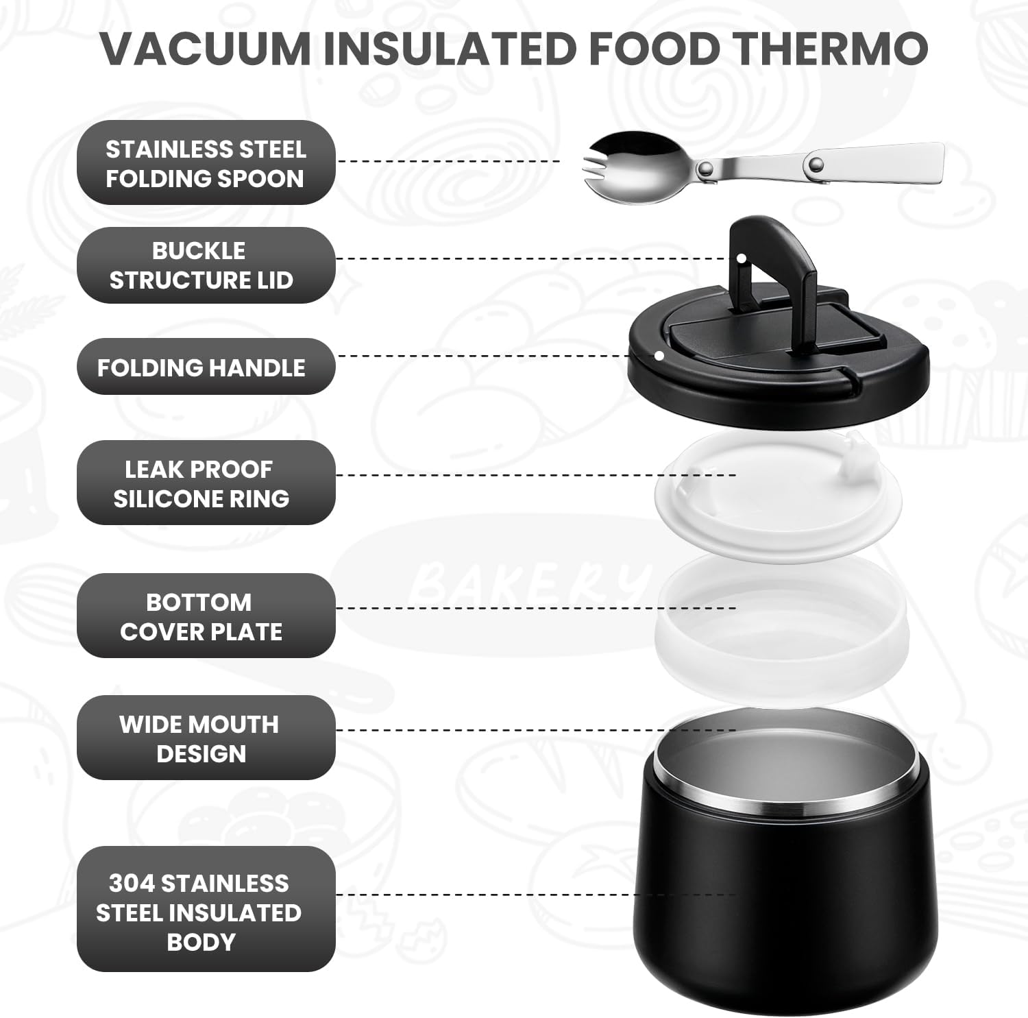 - Leak Proof Design: The compression vacuum design with seal washer guarantees 100% leak-proof, the hidden handle and hidden folding spoon are designed for easy opening and carrying. Don't worry about it spilling out and messing up kids lunch bag. Note, Pay attention to the front and back of the silicone ring when installing, otherwise it will lead to container leakage.