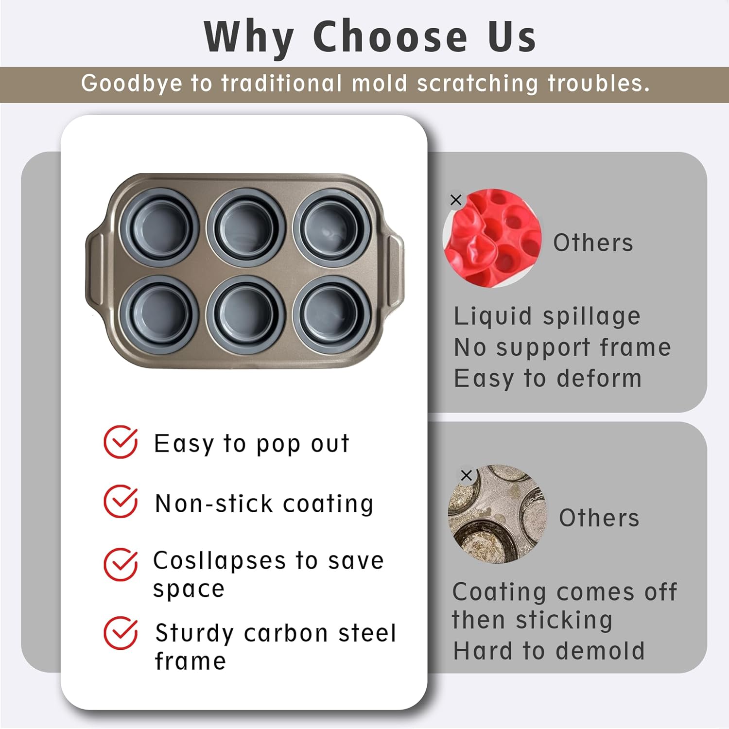 Silicone Muffin Pan Set, 6 Cups Cupcake Pan, With Metal Frame Nonstick Press to Easily Pop Out for Baking Homemade Muffins,Breads, Cupcakes, Egg Bites, BPA-Free Silicone (Grey, 6Cups)