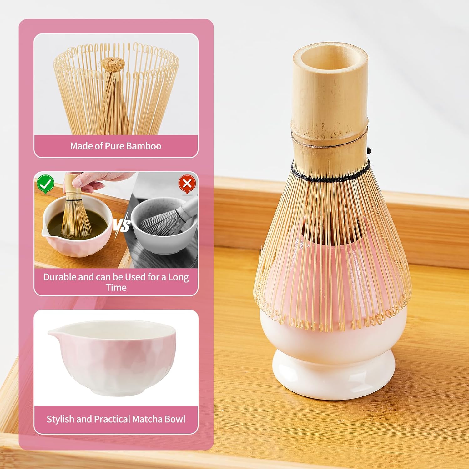 - For A Better Life - Our matcha set is not only perfect for traditional Japanese tea ceremonies, but also ideal for any tea-drinking occasion. Each of our parts is carefully made, and the bamboo pink matcha whisk set are all handmade. We contribute to your beautiful life with the most rigorous attitude.