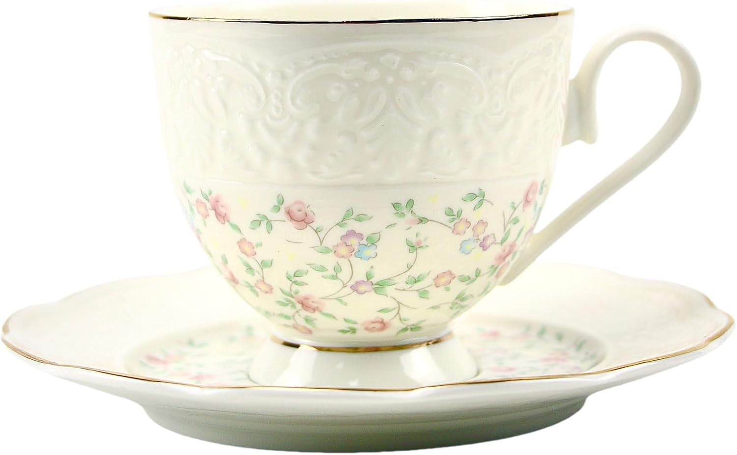 TATSUMI Interglio Embossed Bone China Tea Cup and Saucer Set, 3 Pieces Vintage Style Coffee Cup & Saucer Set For Women Wedding Gift (Starlight Pink, 1 set)