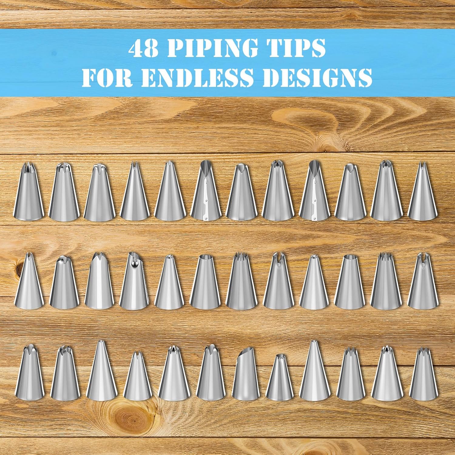 - Piping Bag and Tips: includes 1 piping bag and 48 piping tips; With 48 different piping tips available, covering common shapes, you can unleash your creativity and bring limitless design possibilities