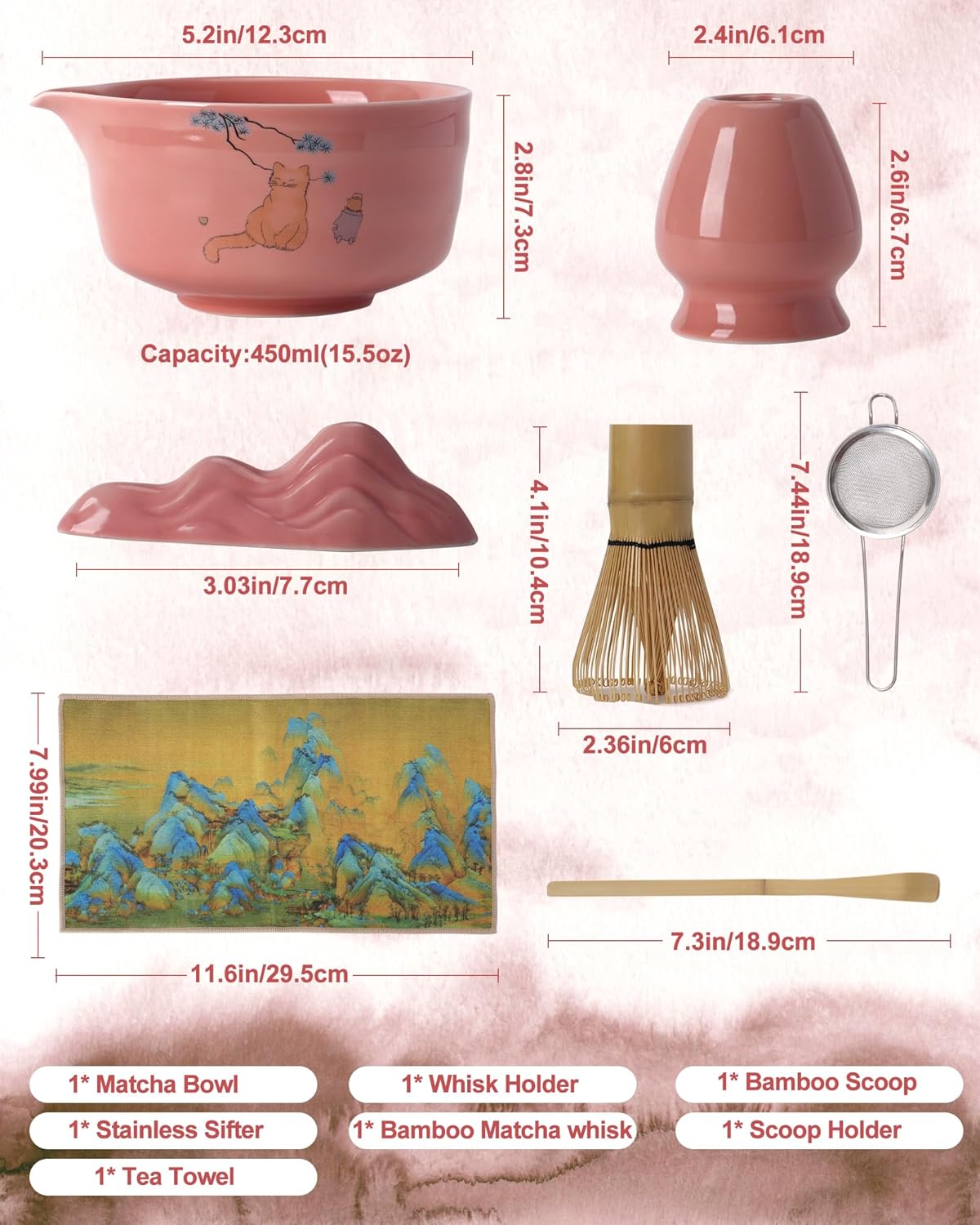 Matcha Set - Japanese Matcha Kit Set 7-Pcs: Ceramic Bowl (Chawan), Matcha Whisk and Holder, Bamboo Scoop, Scoop Rest, Sifter and Towel - Authentic Tea Ceremony Tools for Tea Lovers (Hot Pink)