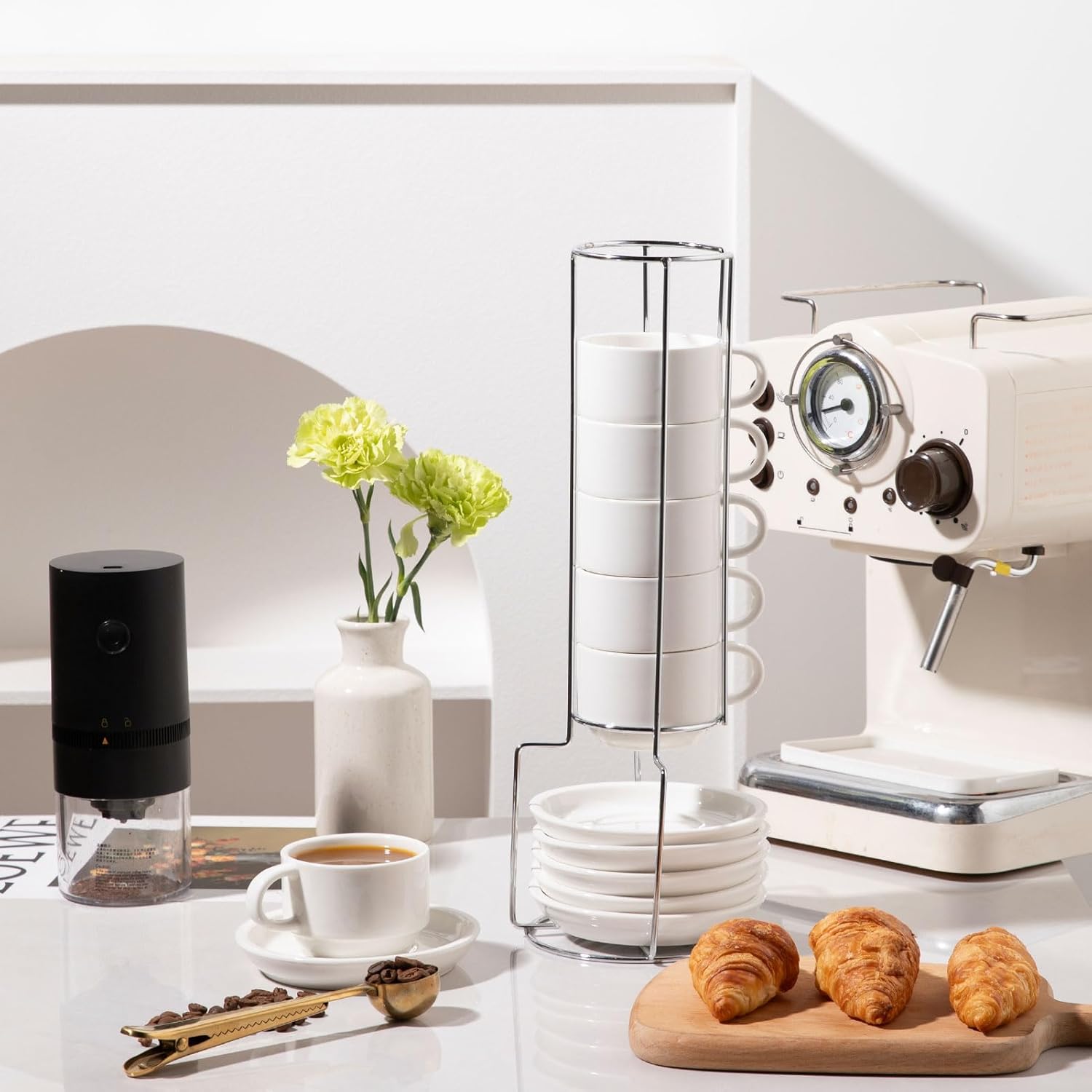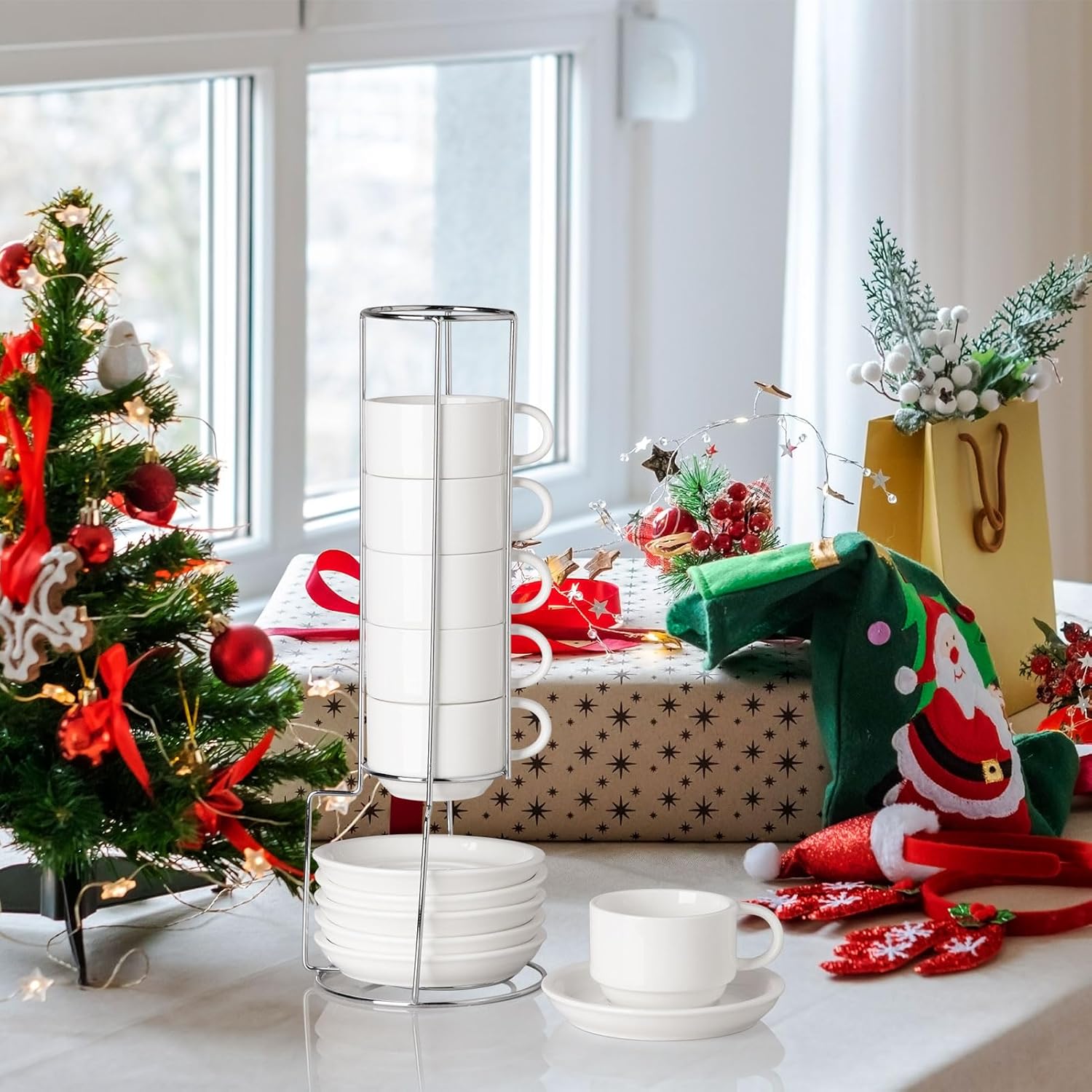 - Elegant Design - The set consists of 6 coffee cups (4 oz), 6 plates and a metal frame. Multiple colors. The cups were neatly stacked on metal shelves. It's elegant by the coffee machine.