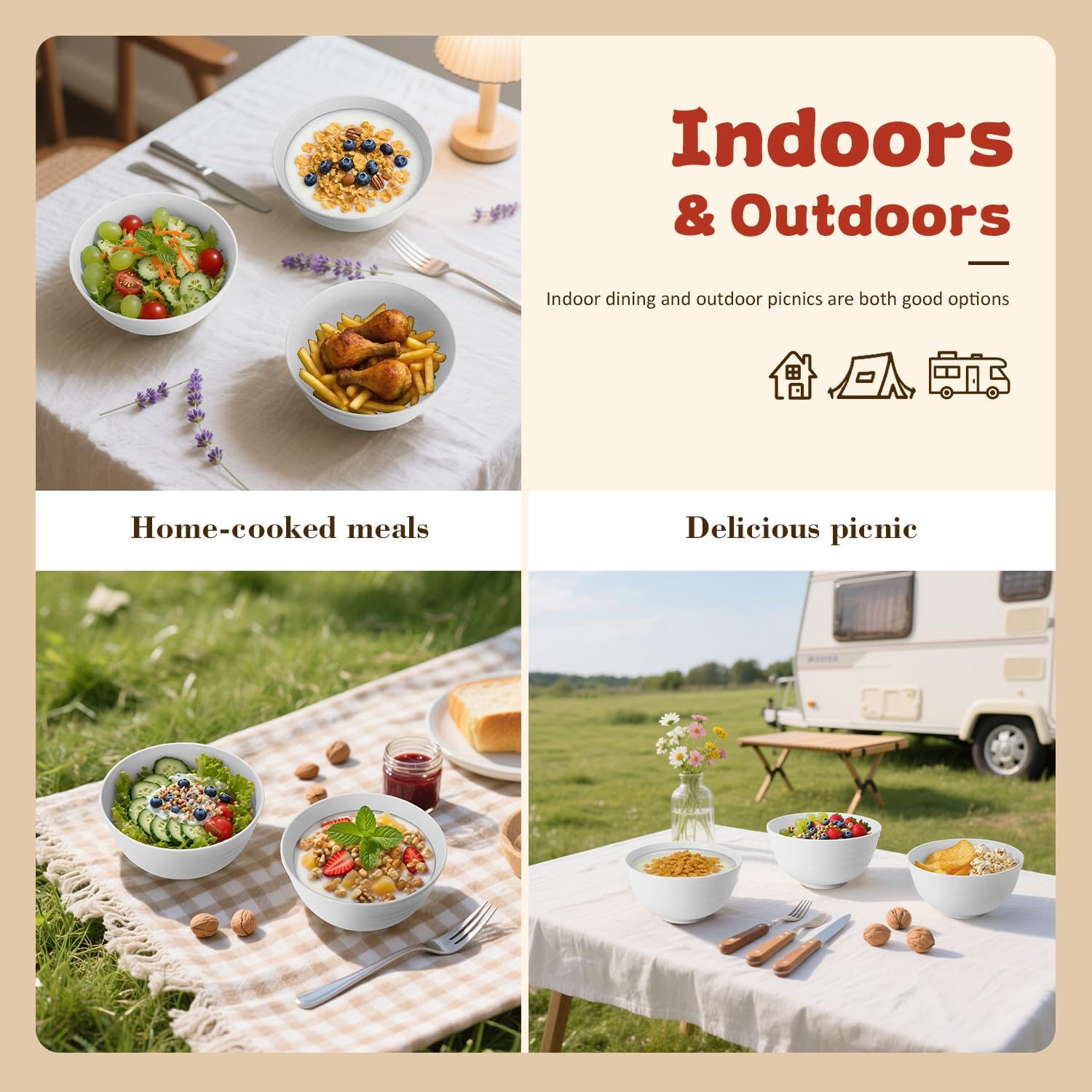 - ใ๐๐ป๐ฑ๐ผ๐ผ๐ฟ๐ & ๐ข๐๐๐ฑ๐ผ๐ผ๐ฟ๐ ๐จ๐๐ถ๐ป๐ดใ- These bowls are lightweight and unbreakable,featuring a smooth surface that makes cleaning effortless.Ideal portable bowls sets for camping,picnic,RV trips, and outdoor adventures.