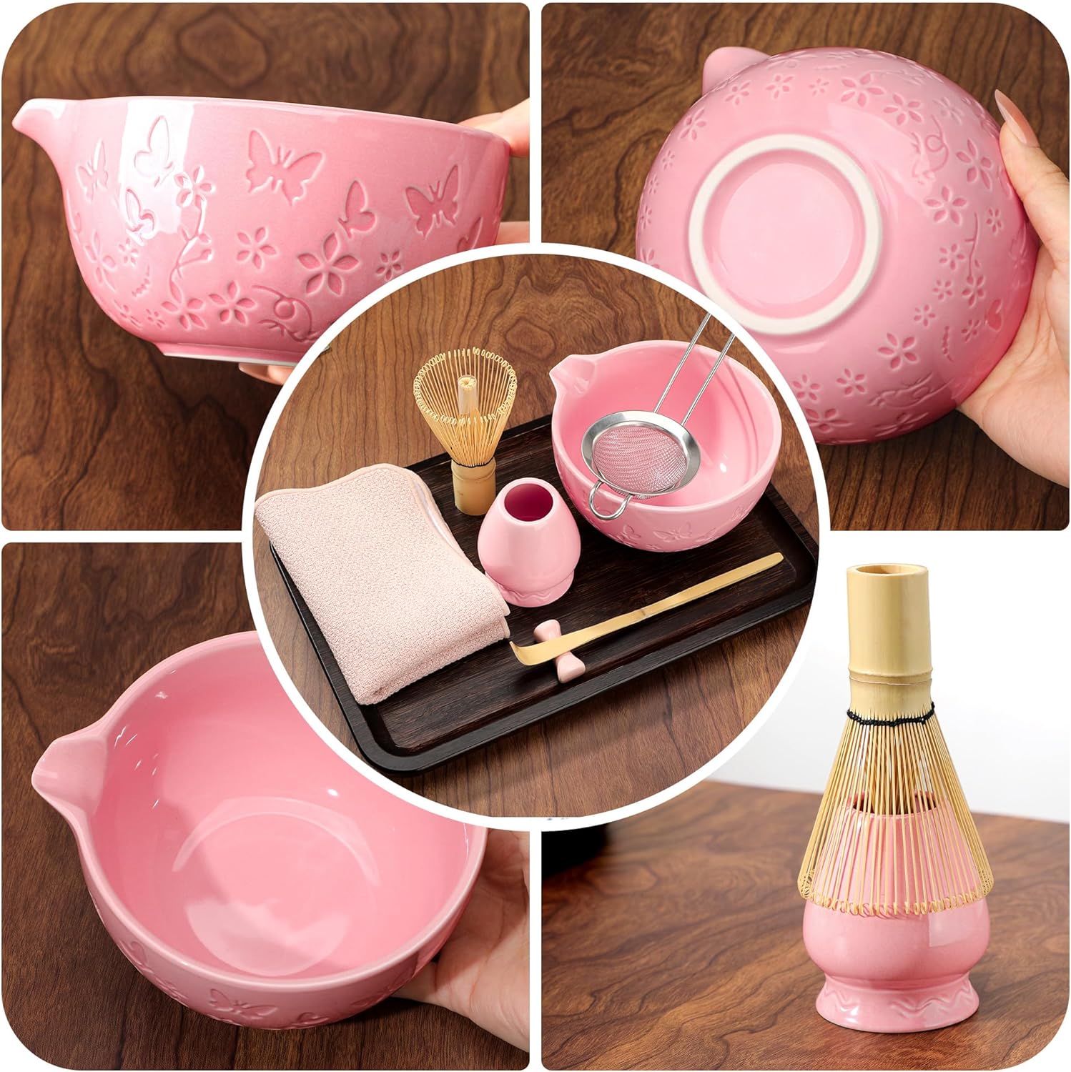 Matcha Whisk Set 7 PCS Matcha Bowl, Matcha Whisk and Holder, Bamboo Scoop and Scoop Rest, Stainless Sifter and Tea Towel Ceramic Matcha Set Japanese Matcha Kit for Matcha Lovers Pink