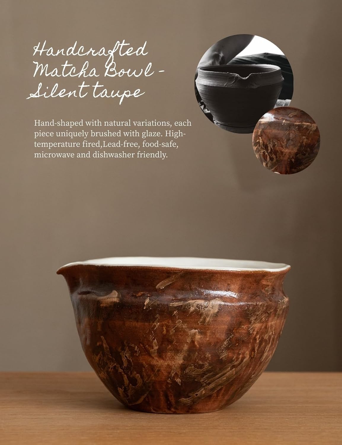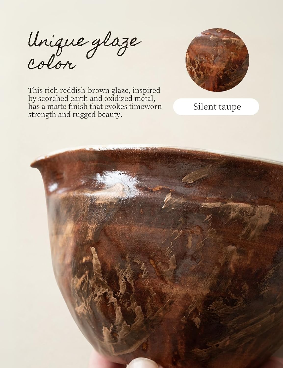 - Handcrafted Wabi-Sabi Bowl with Silent taupe: Hand-shaped with natural thickness variations, then brush-glazed stroke by stroke. Each product is unique. High-temperature fired , food-safe, microwave-safe, and dishwasher-safe. Earthy warmth meets fire-born texture — This rich reddish-brown glaze is inspired by scorched earth and oxidized metal. The matte surface evokes timeworn strength, crafted for those who appreciate rugged beauty.