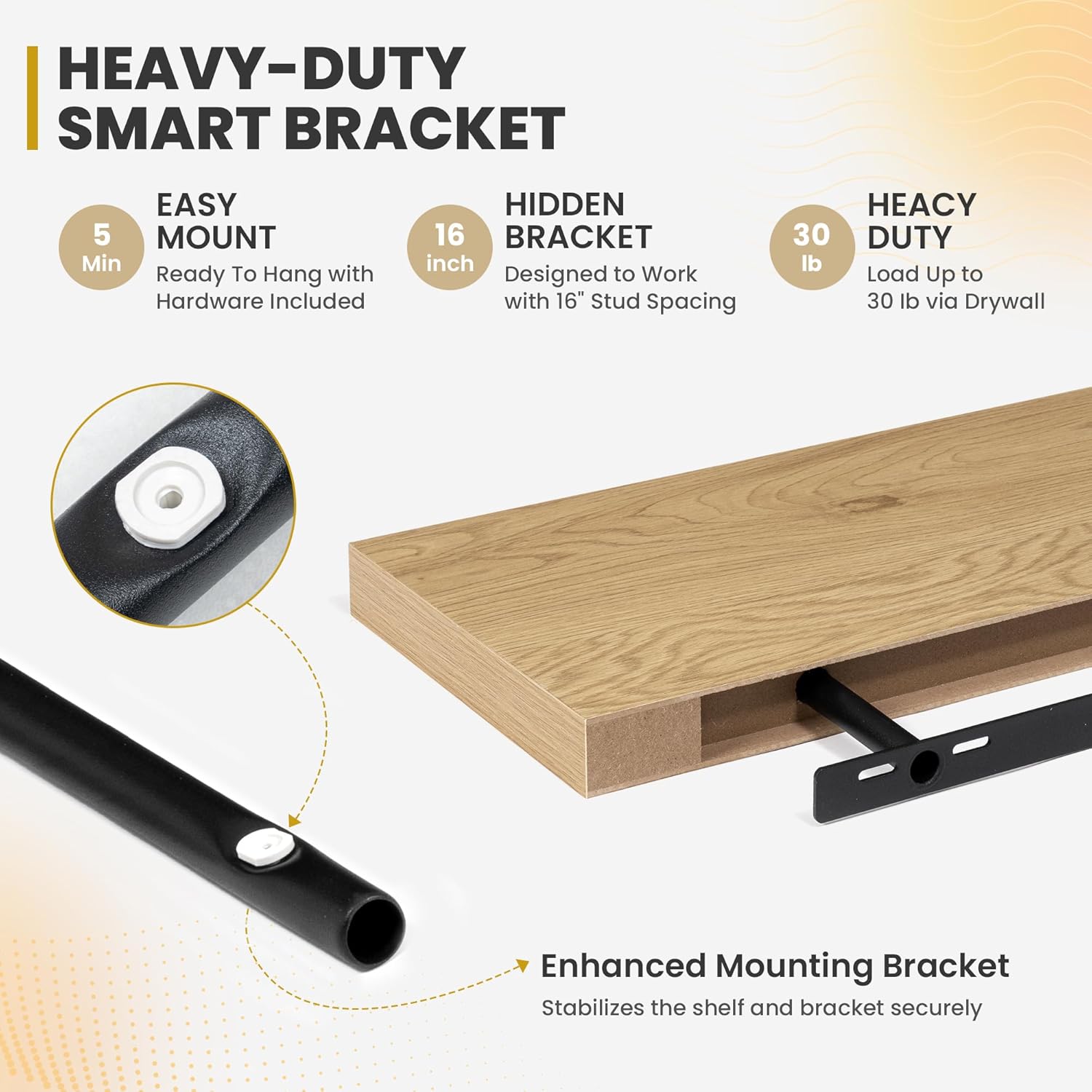 - [ROBUST & SECURE MOUNTING]: Equipped with a sturdy, hidden mounting bracket, these 16-inch floating shelves ensure solid support for your items. Designed for easy and secure installation, they come with all necessary hardware for a firm, wobble-free setup, allowing you to confidently display decor, photos, or functional items with style.