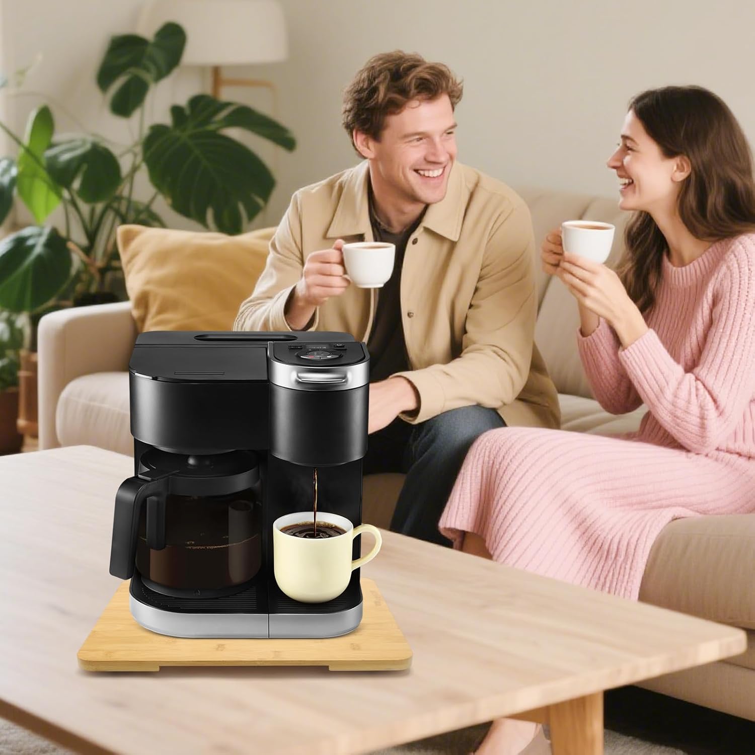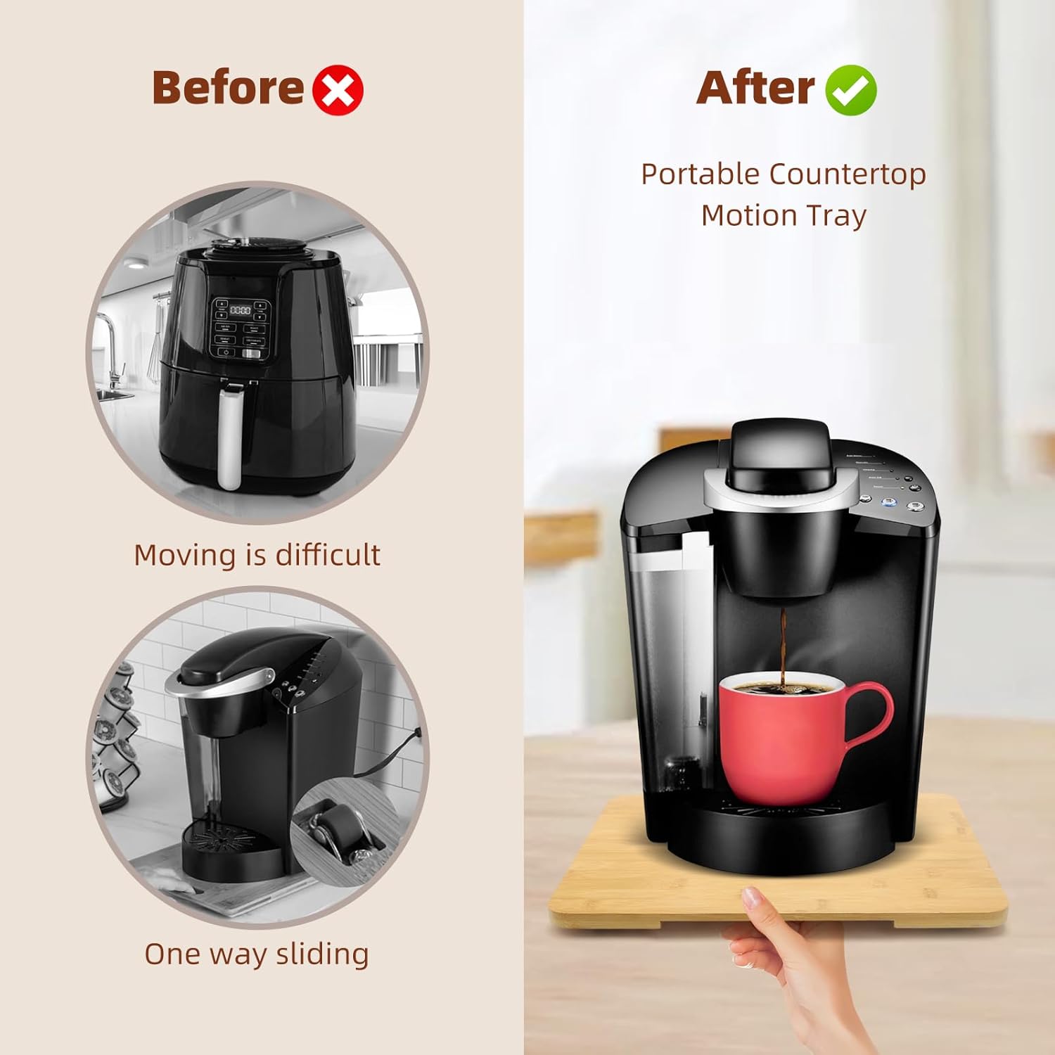 - NON-SLIP BAMBOO RESISTANCE SLIDING TRAY: Our sliding tray for coffee maker thickened, varnished, 100% natural bamboo kitchen sliders for appliances contain a non-slip timber surface that holds your appliances in place. Coffee pot slider tray for countertop mat for coffee station station with recessed handles on all sides designed to slide effortlessly in all directions.
