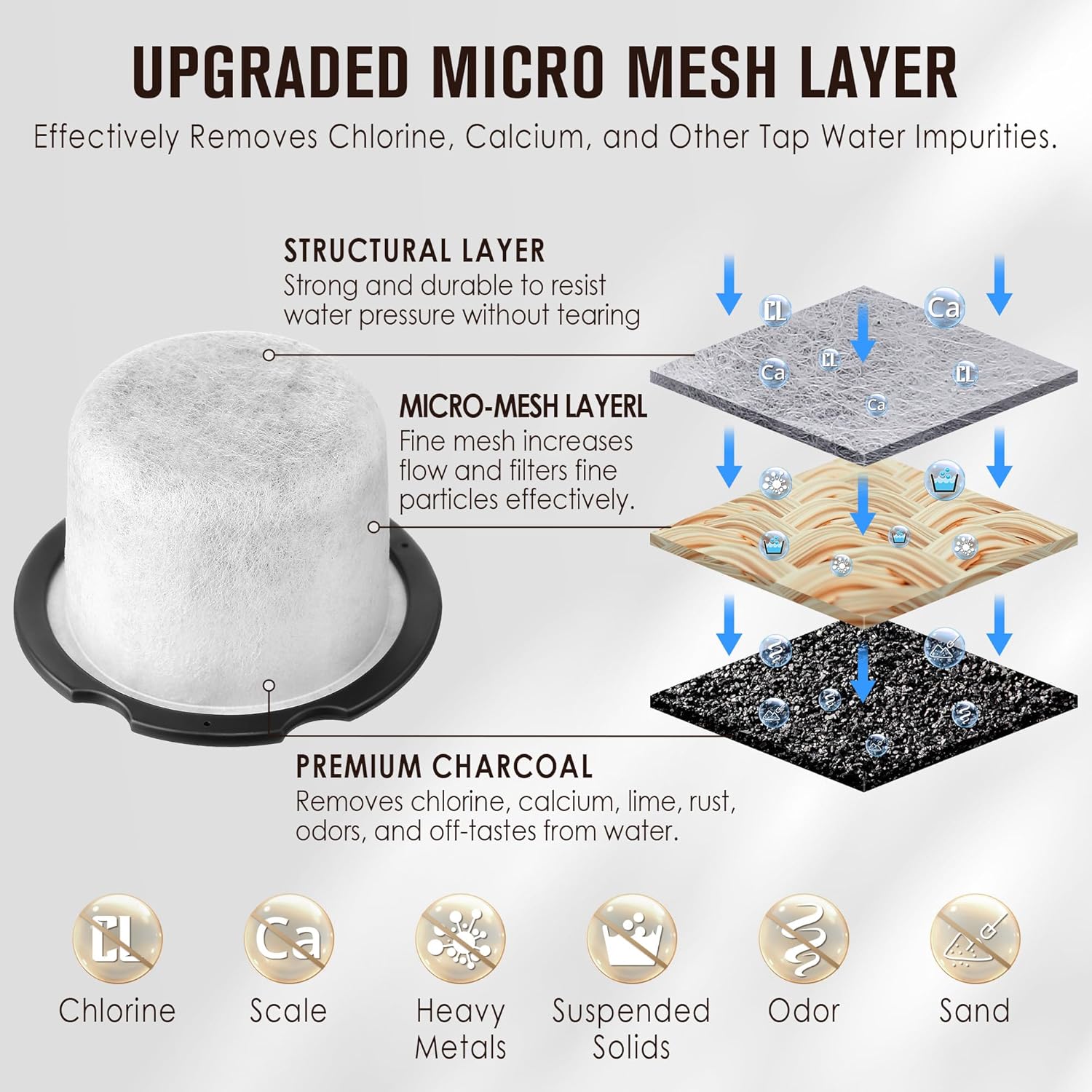 - Upgraded Micro Mesh Layer: The coffee maker water filter is made with high quality microporous material and activated carbon, the carbon is sealed inside the filter, not the machine, for better safety and cleanliness. The fine mesh boosts filtration area, speeds up water flow, and removes impurities more effectively. Strong and durable to resist water pressure without tearing