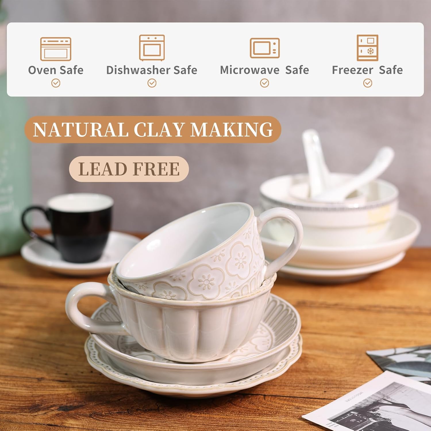 - Durable & Safe: Made from premium bone china, these coffee cups ceramic are lightweight yet incredibly durable. Safe for use in the microwave, oven, dishwasher, and even the refrigerator, they're built for daily convenience. The non-porous glazed surface resists stains and is easy to clean—perfect for busy mornings or entertaining guests.