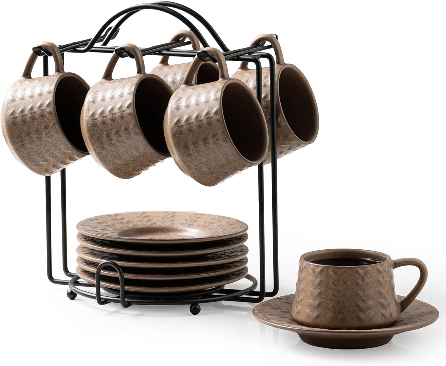 Espresso Cups Set, 4 Oz Porcelain Coffee Cups with Saucer and Metal Stand Small Cappuccino Cups Set of 6 Demitasse Cups for Espresso, Latte, Cafe Mocha, Cappuccino, and Tea, Brown