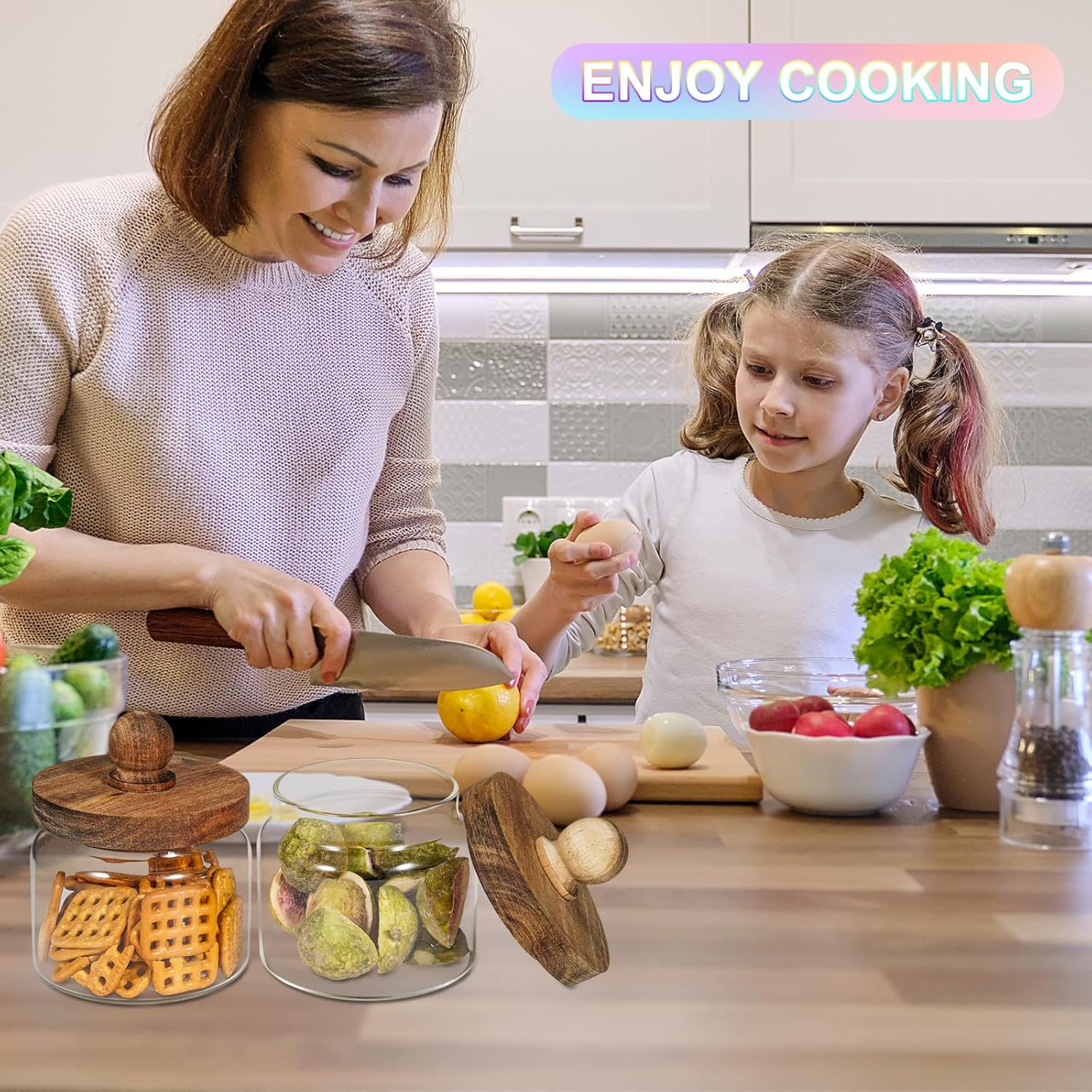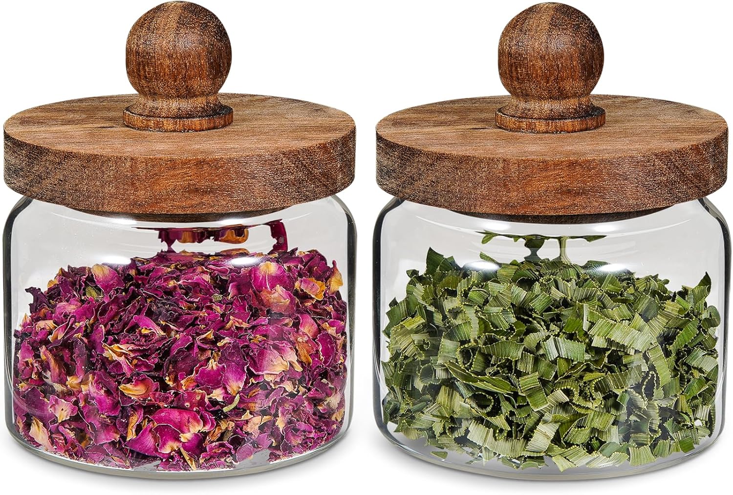 - - 【WIDE APPLICATIONS】 Small glass canisters for pantry organization are suitable for storing various dried ingredients to retain their freshness, with clear glass jars, you can easily see inside and quickly find the ingredients you need.Glass jars with wood lids perfect for storing dry food , such as,cookies,dried beans,pepper, oatmeal,jams, chutneys, rice, flour, tea, coffee, biscuits, candy,cheese,flour, sugar, seeds,etc. Keep your kitchen tidy and safe,saving space and convenient .